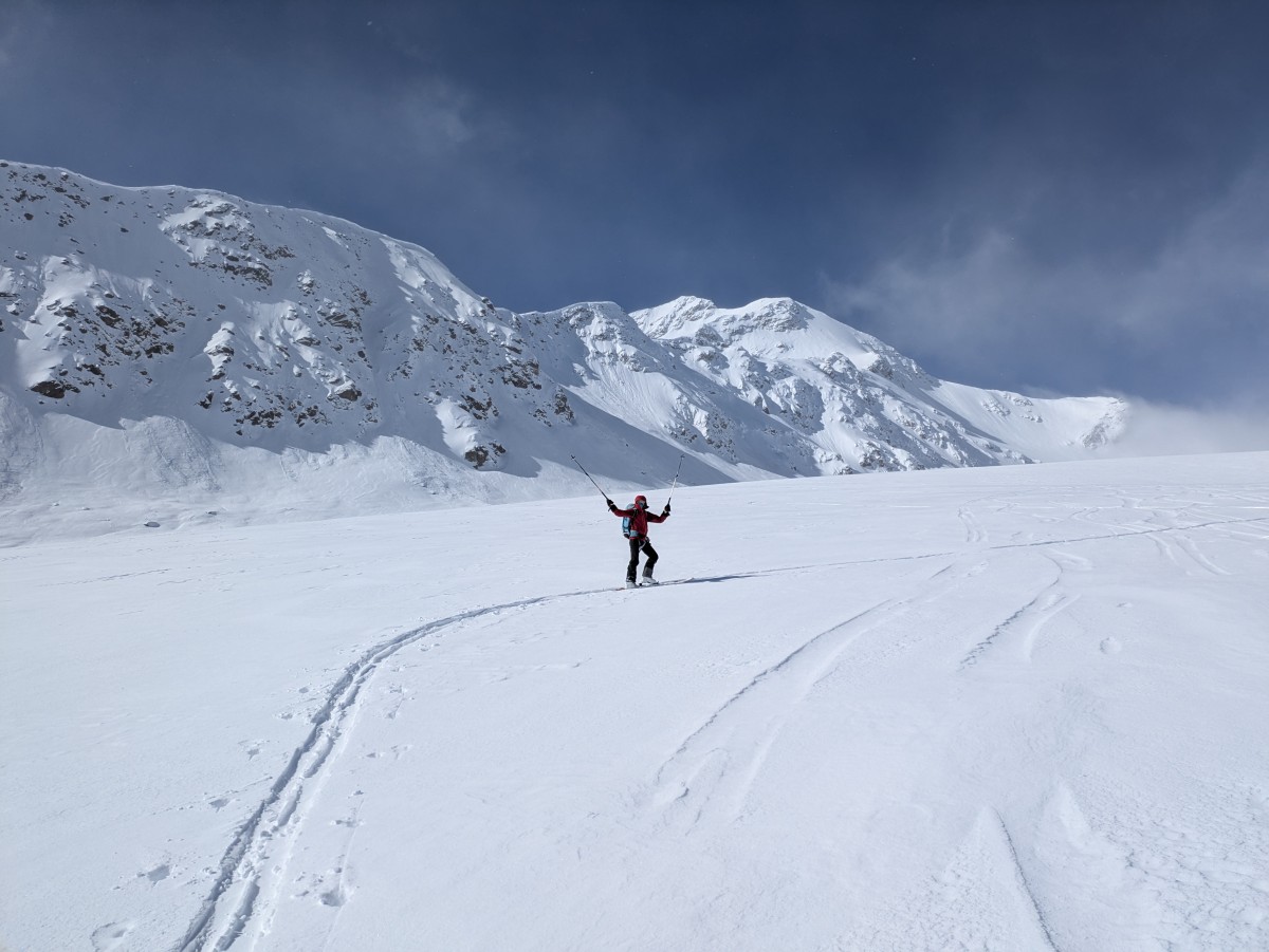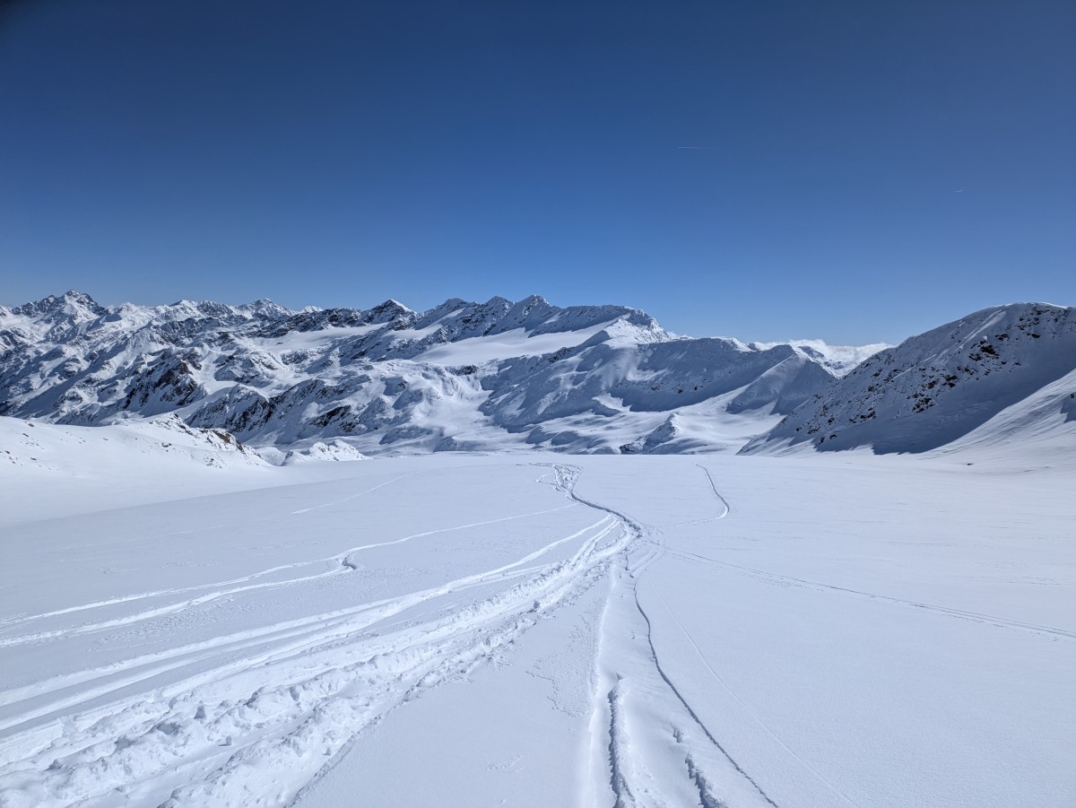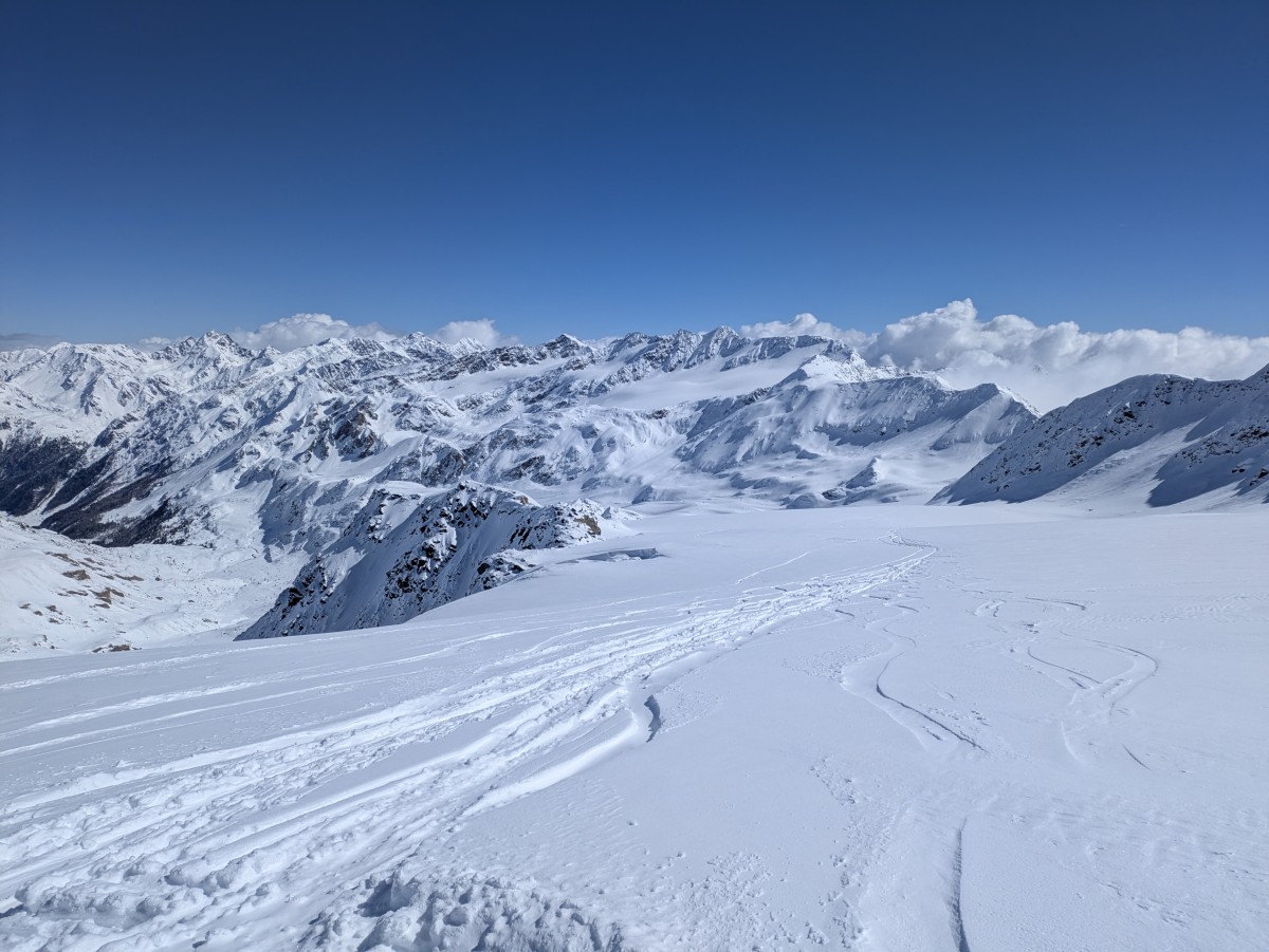 Wir rauschen pulvrig über die sanft geneigte Gletscherfläche vor einer unfassbaren alpinen Pracht zur Marteller Hütte hinab. Kurz