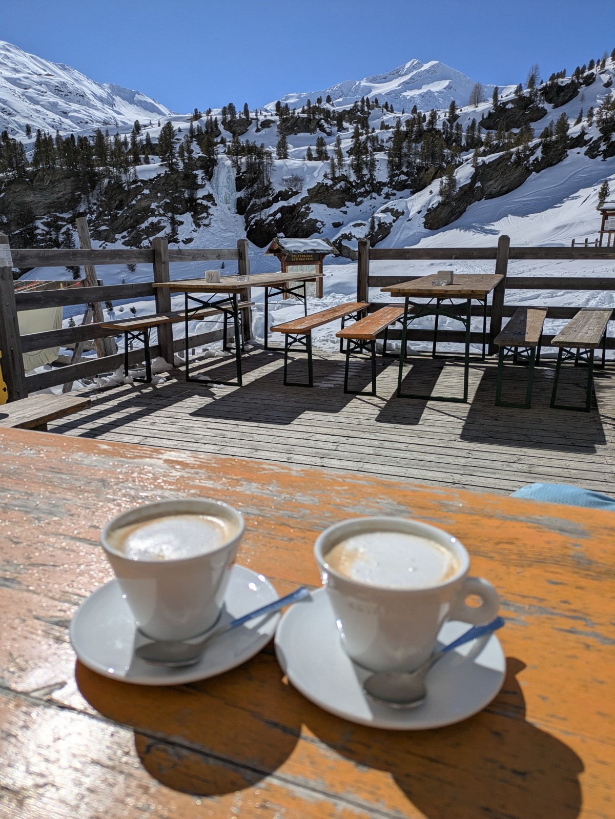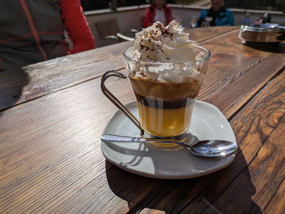 An der Zufallhütte angekommen gönnen wir uns auf der Sonnenterasse hochzufrieden einen Cappucino und lassen den schönen Tag geruhsam