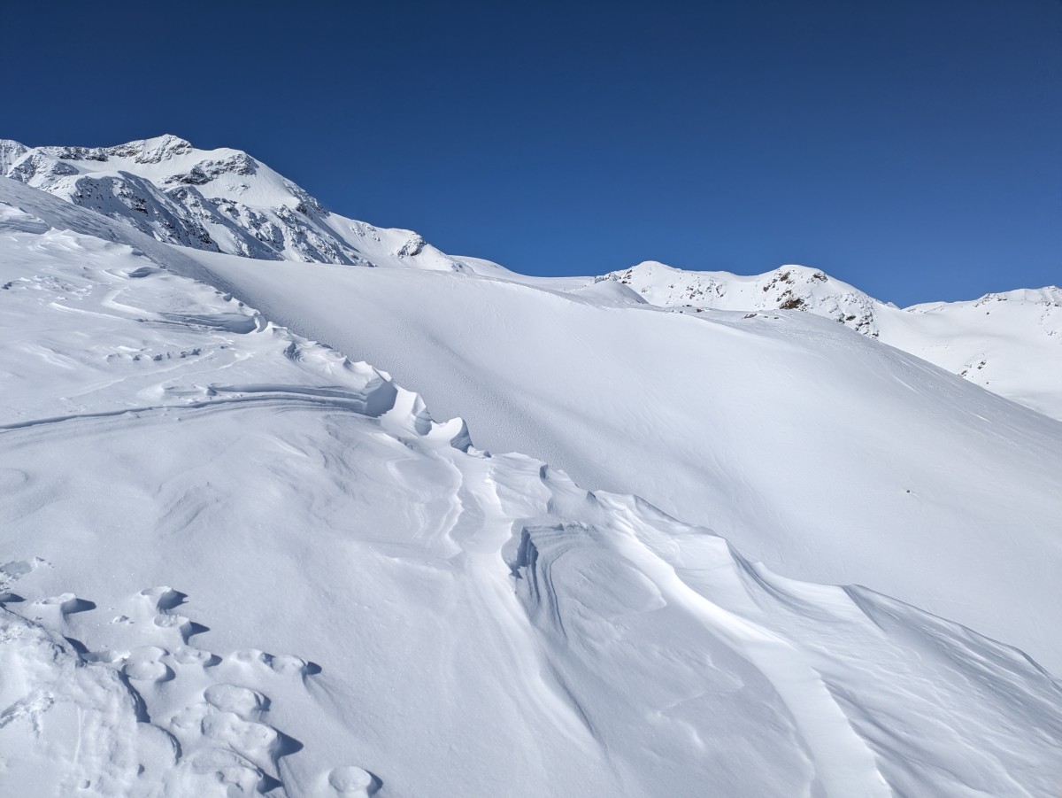 ist in den südseitigen Hängen durch die vielen Spuren stark zerackert, und in den unberührten Stellen durch die intensive Einstrahlung