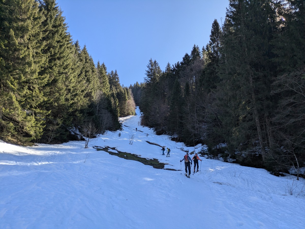 Wir tappen wieder zu den Latten hinab und suchen uns in dem Ameisenhaufen eine Stelle, an der wir die Ski wieder anschnallen können.