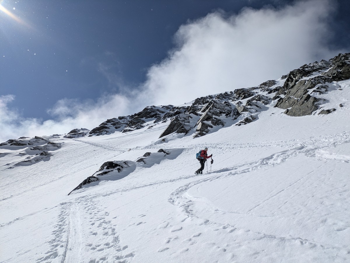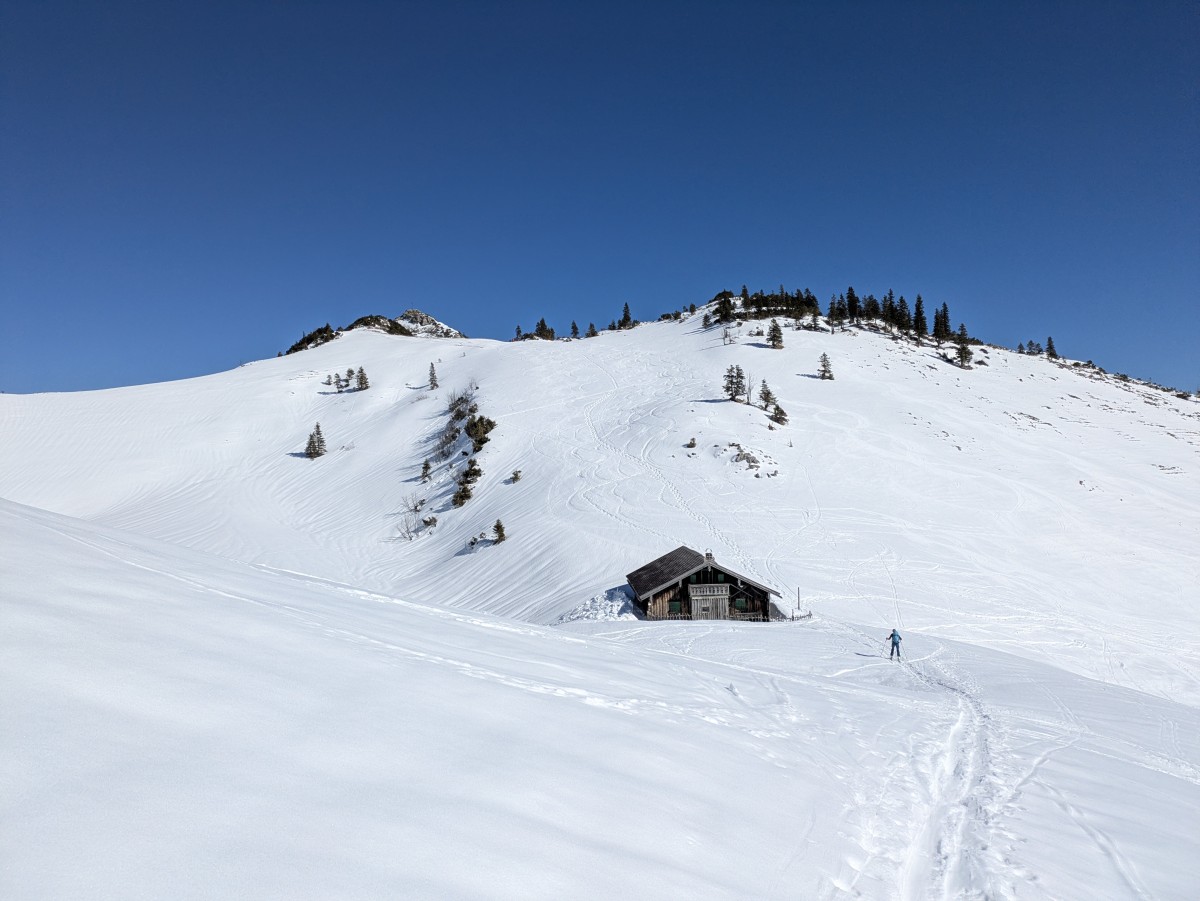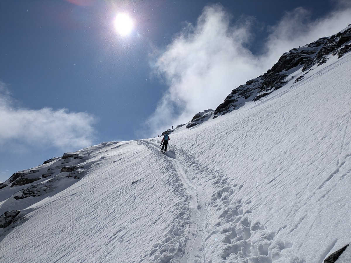 Nach einer Abfahrt durch Butterfirn zur Freudenreichalm fellen wir nochmal an und laufen zum Rauhkopf hinauf.