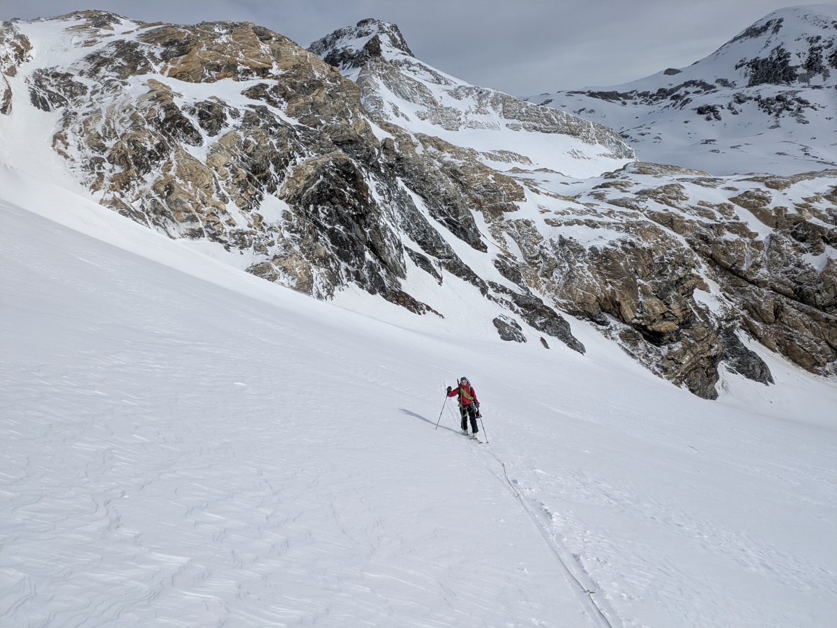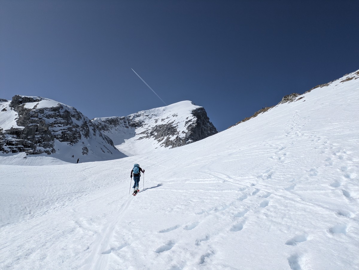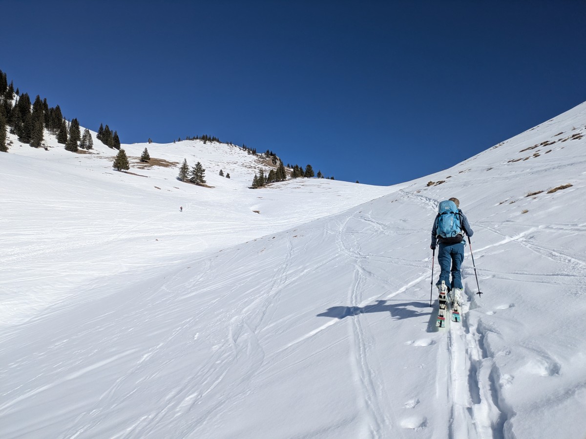 Nach einer Abfahrt durch Butterfirn zur Freudenreichalm fellen wir nochmal an und laufen zum Rauhkopf hinauf.