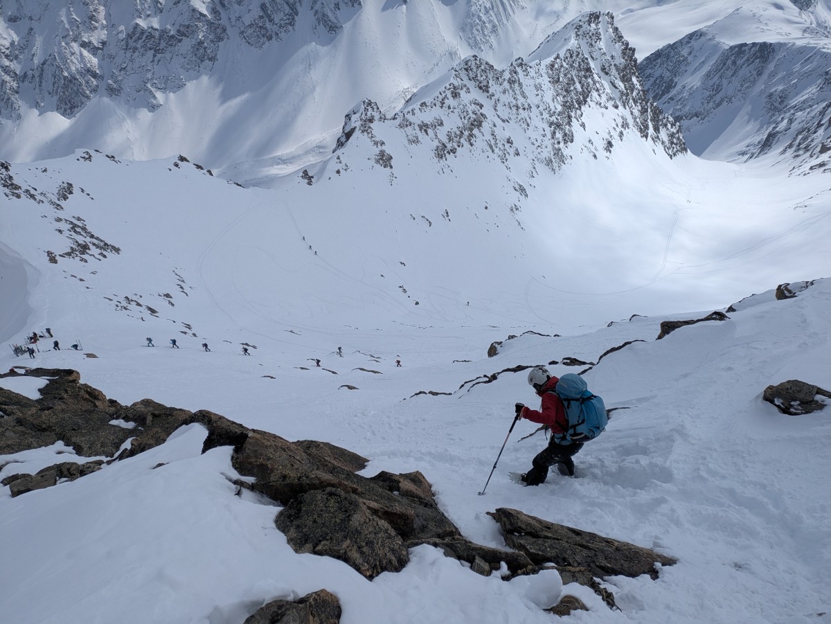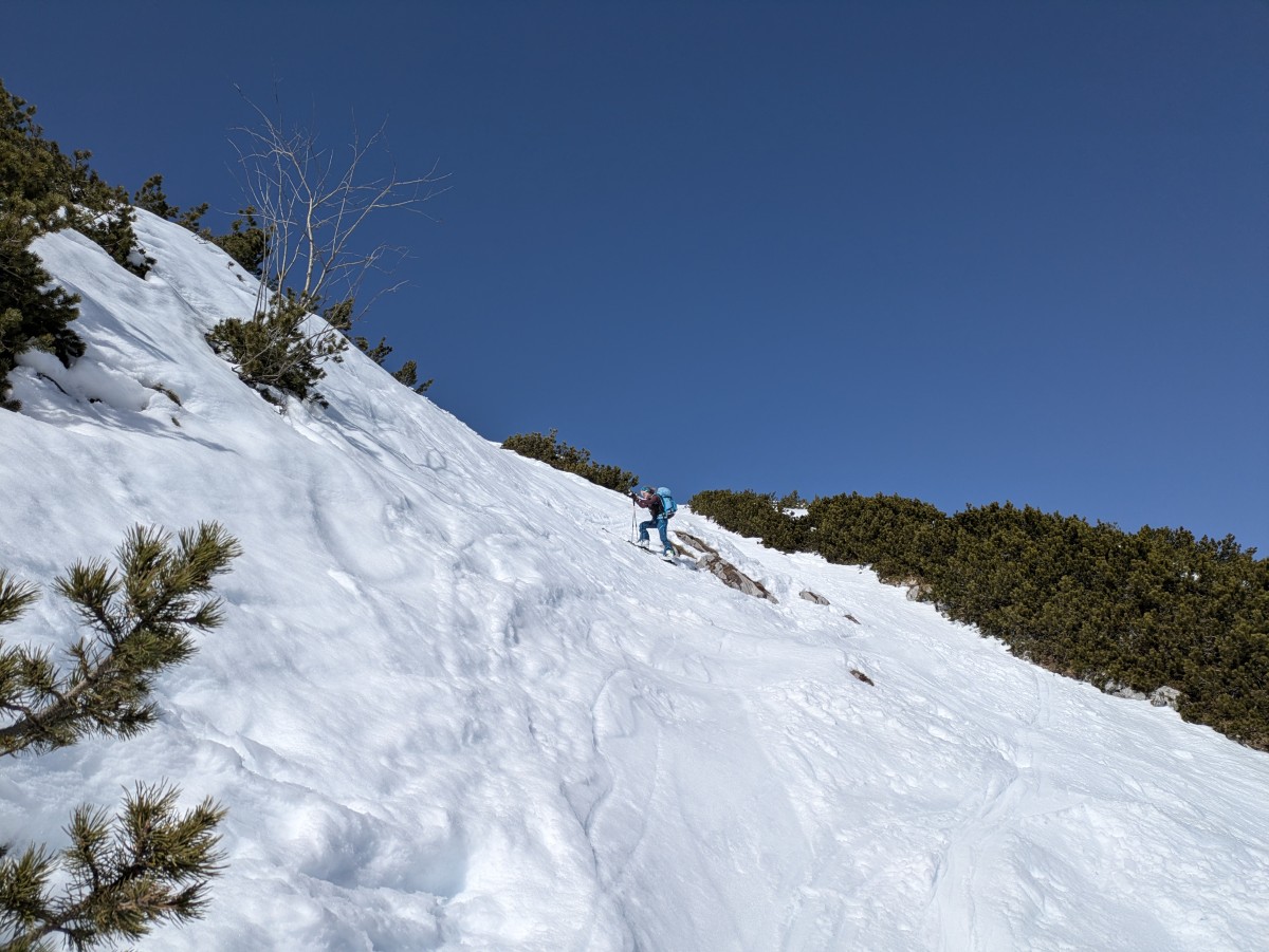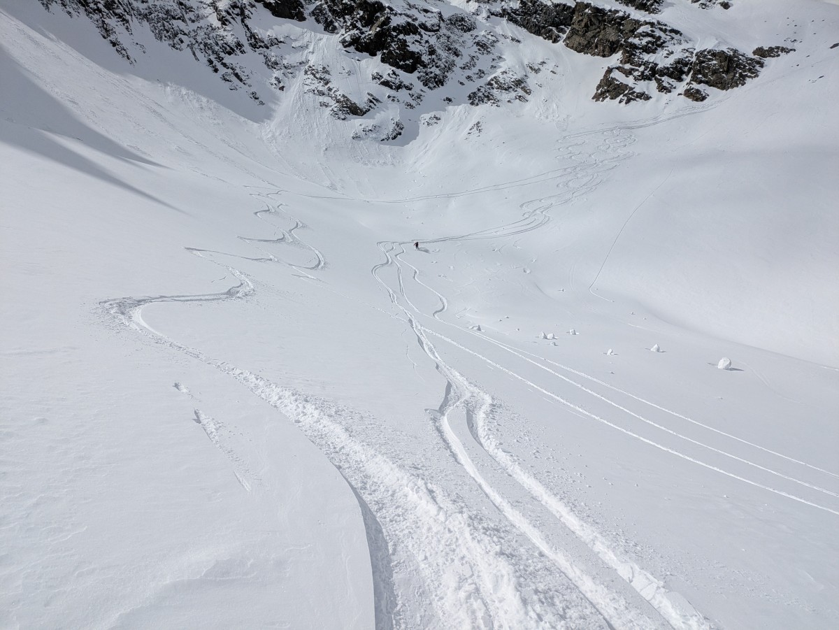Vom Gipfel der Blick hinab auf die Aufsteigsspur, die dann in den Steilhängen verschwindet.