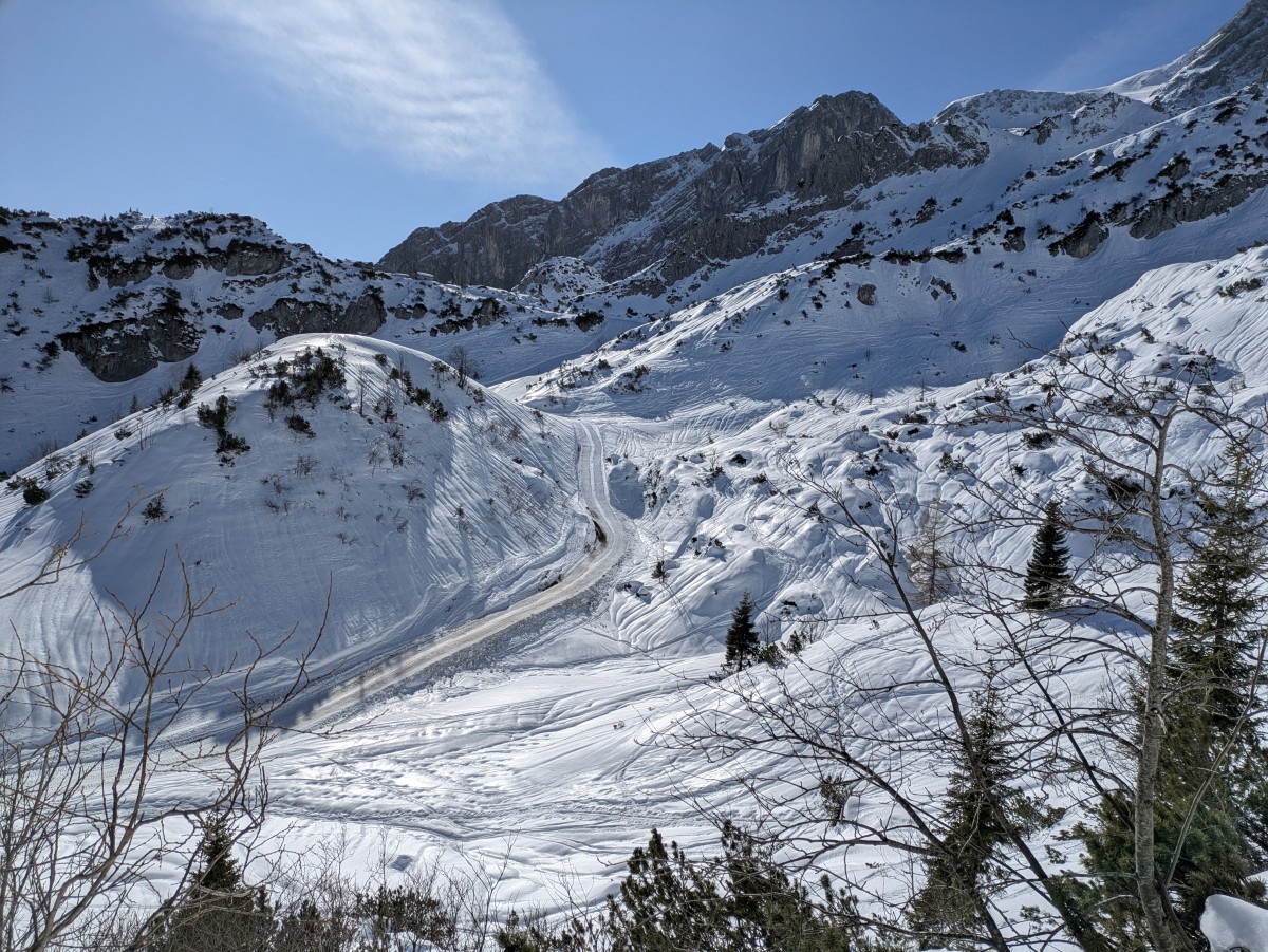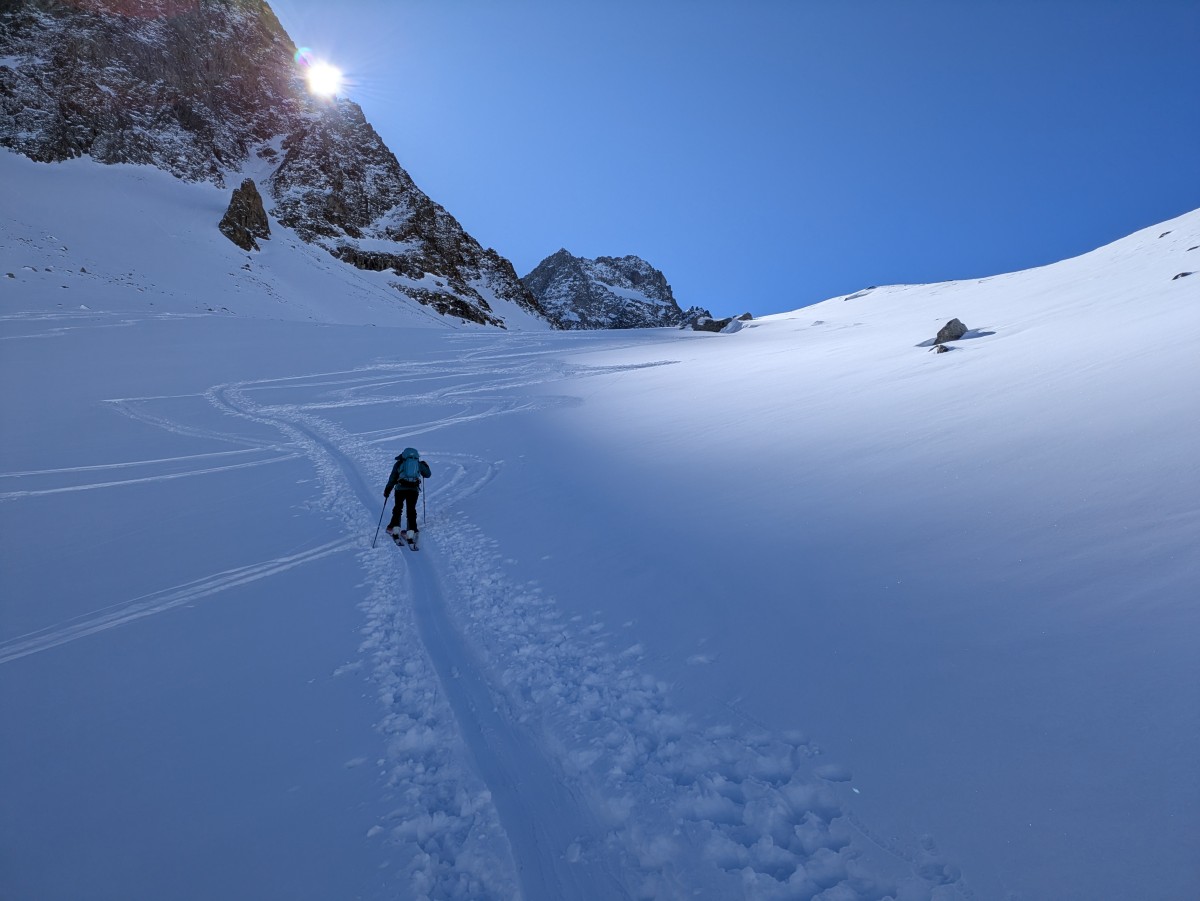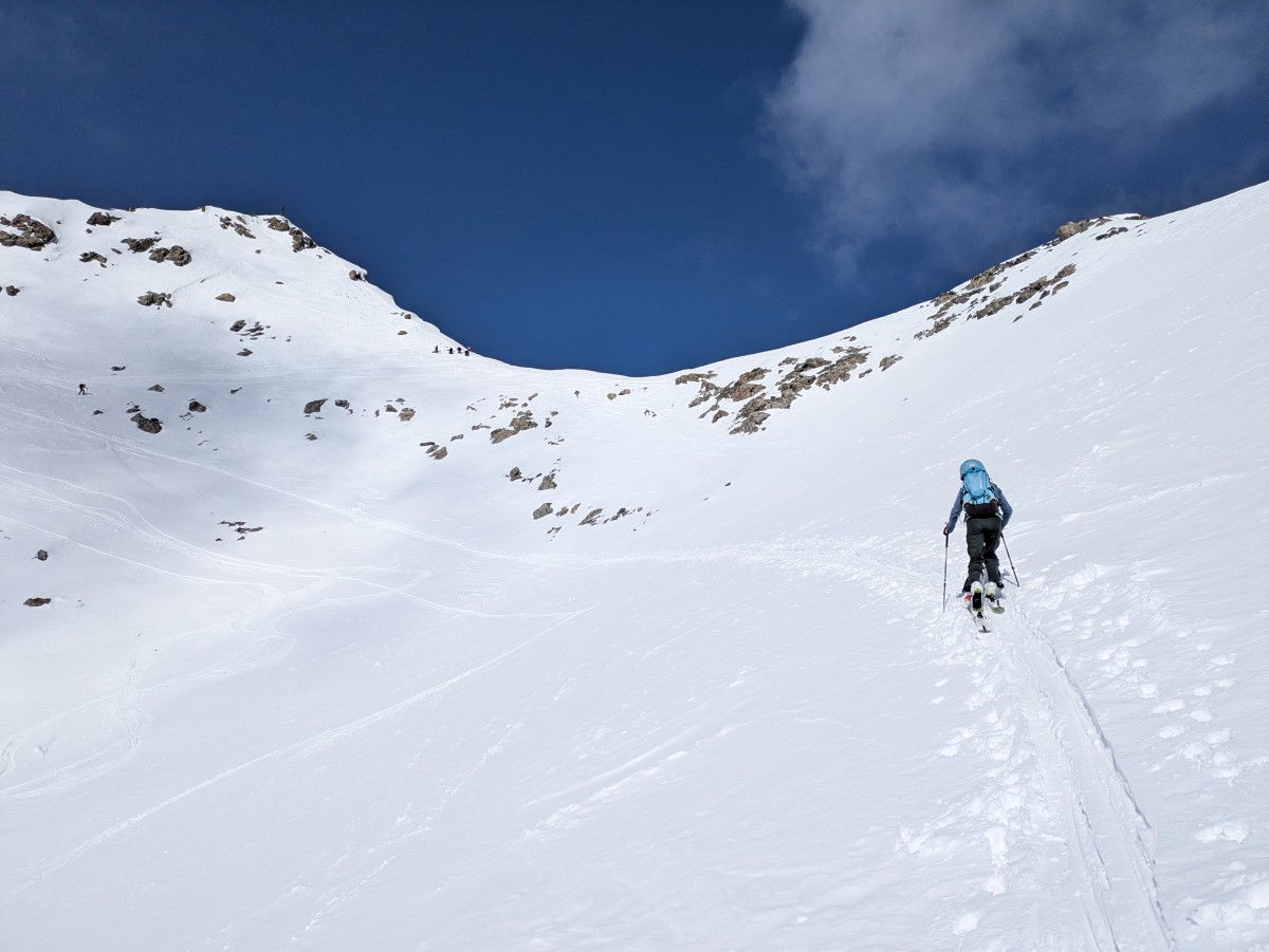 Vom Gipfel der Blick hinab auf die Aufsteigsspur, die dann in den Steilhängen verschwindet.