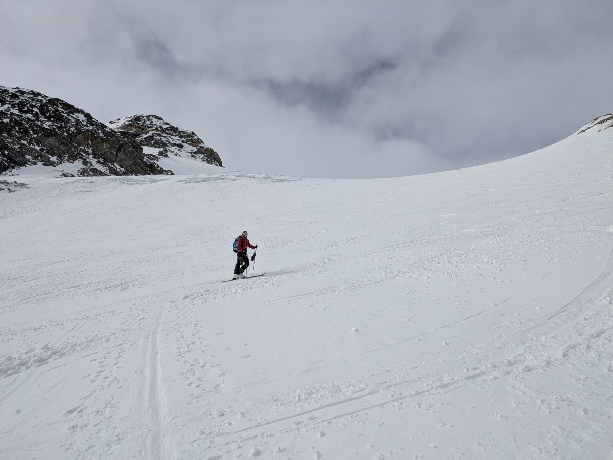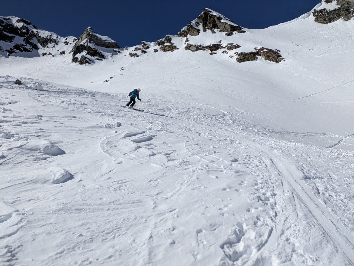 Nach eine kurzen Pause genießen wir den Firn in der Abfahrt - wunderbar! Beim Bernadein-Schlepplift schauen wir uns kurz in die