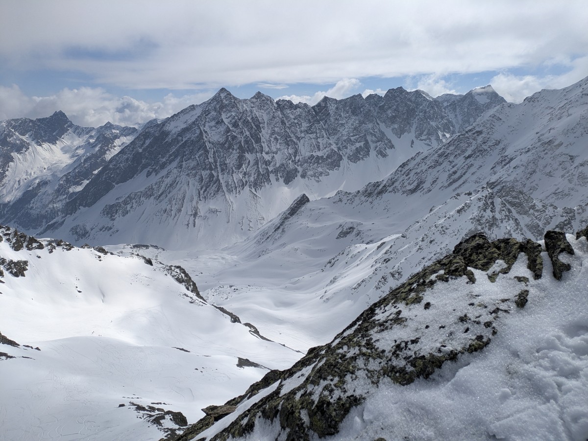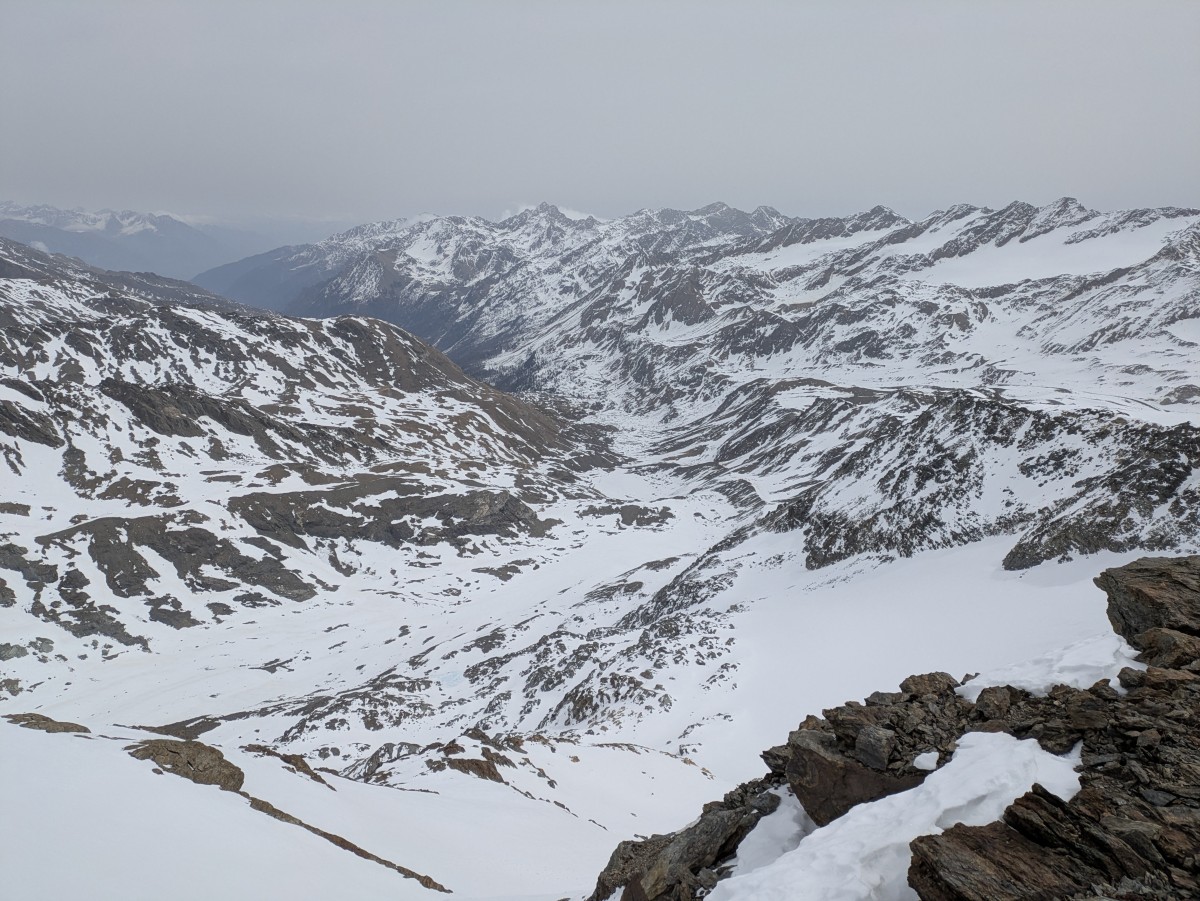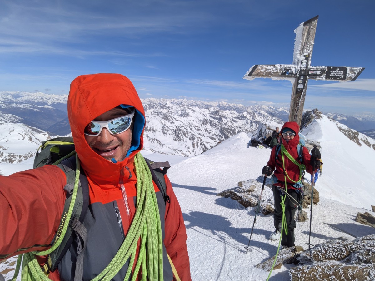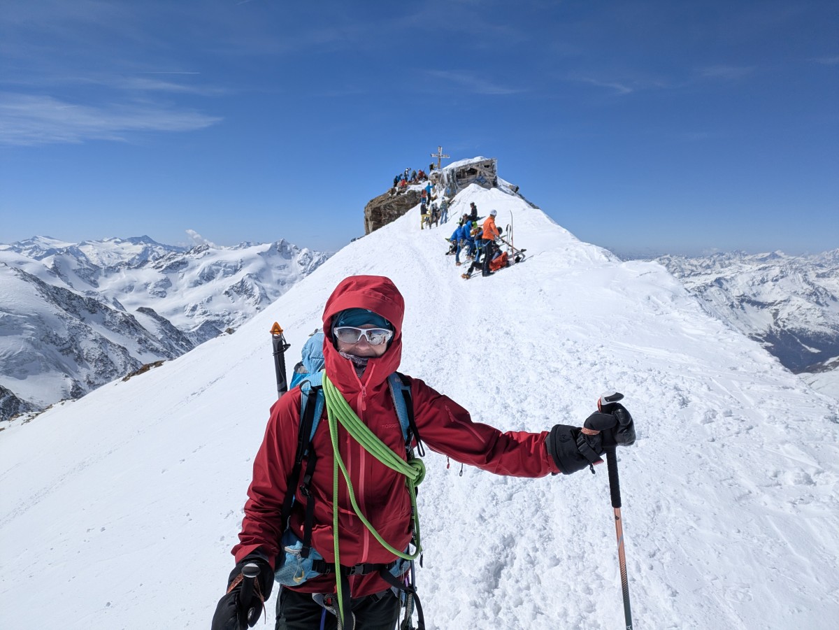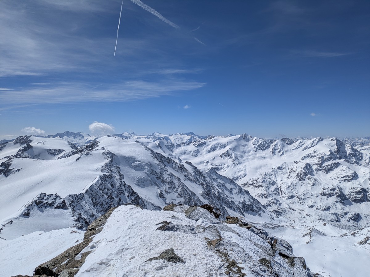 Nach dem letzten steilen Aufschwung zum Gipfel erreichen wir das Skidepot und stapfen unschwierig weiter zum höchsten Punkt. Tatsächlich können wir eine Viertelstunde zu zweit allein die prächtige Rundumsicht bewundern.