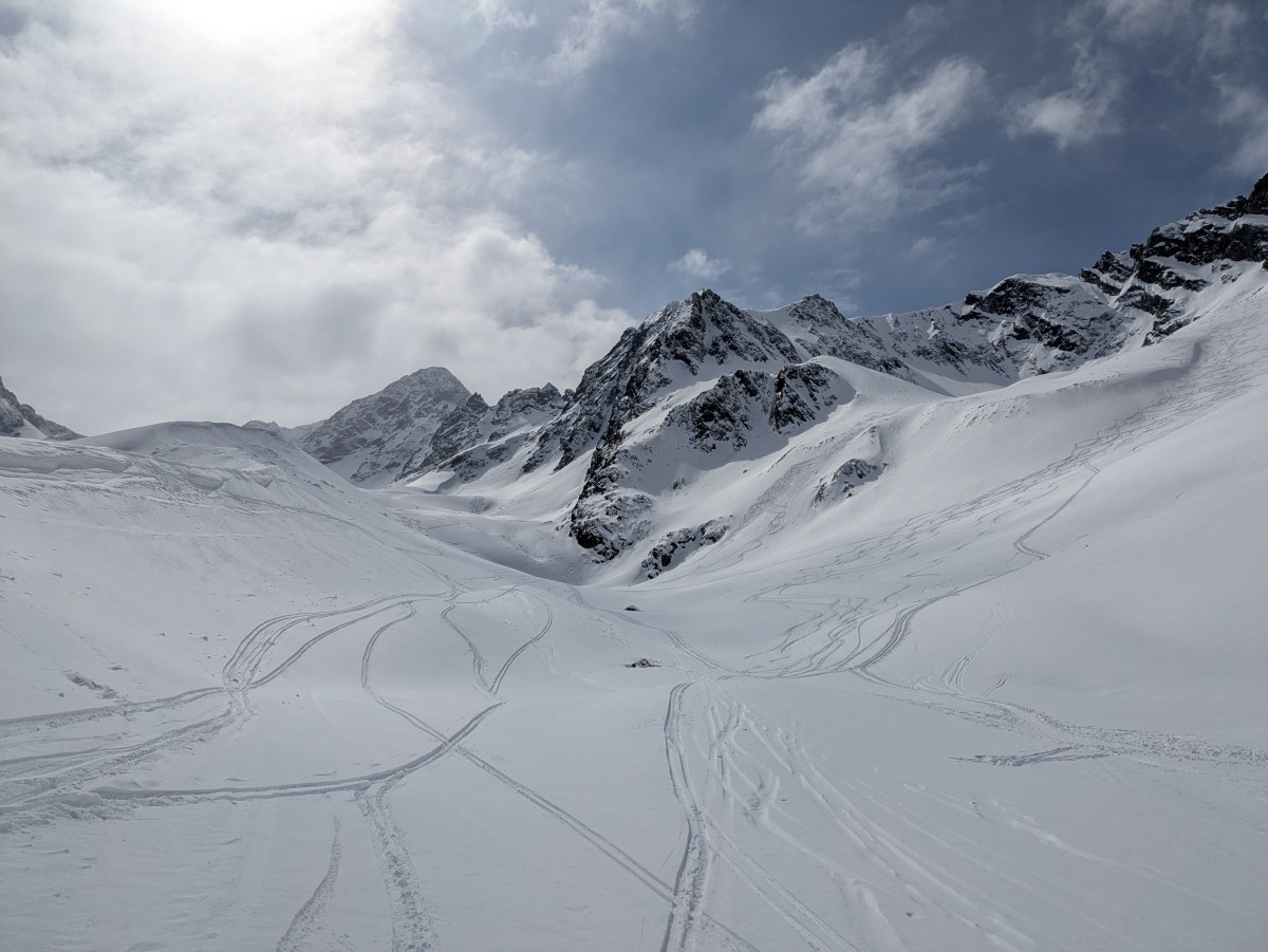 Beim Anblick dieser Spuren freuen wir uns bereits auf die Abfahrt unter dem blauen Himmel dieses Traumtages.