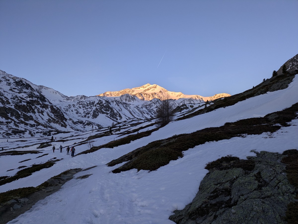 Gipfel wir heute angehen möchten; die Entscheidung fällt auf den Längentaler Weißen Kogel. Auf gut angelegter Spur kommen wir unschwierig voran auf den Gletscher. Endlich geht die Sonne auf und spendet uns hier oben etwas angenehmere Temperaturen.