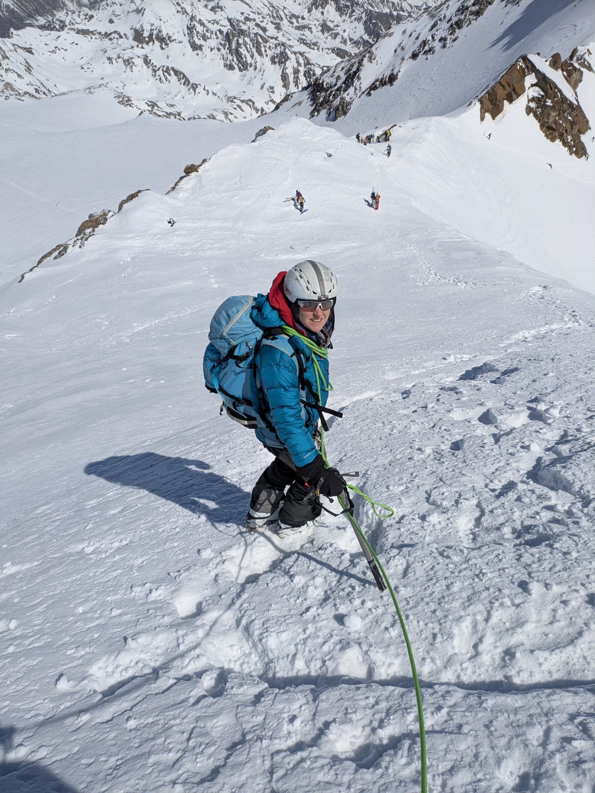 Depot aus an dem Blockgrat hinauf zum höchsten Punkt. An den neuralgischen Stellen bilden sich sowohl im Aufstieg als auch im Abstieg