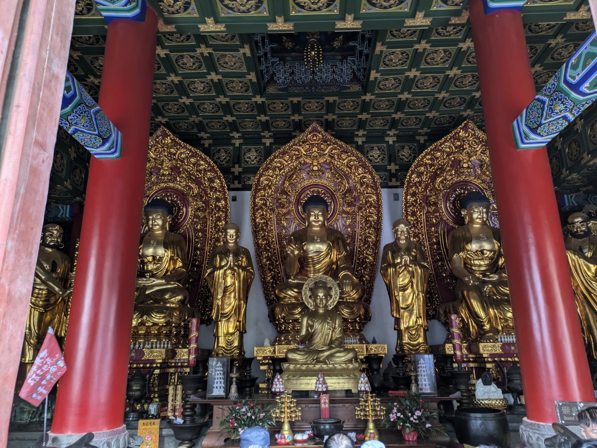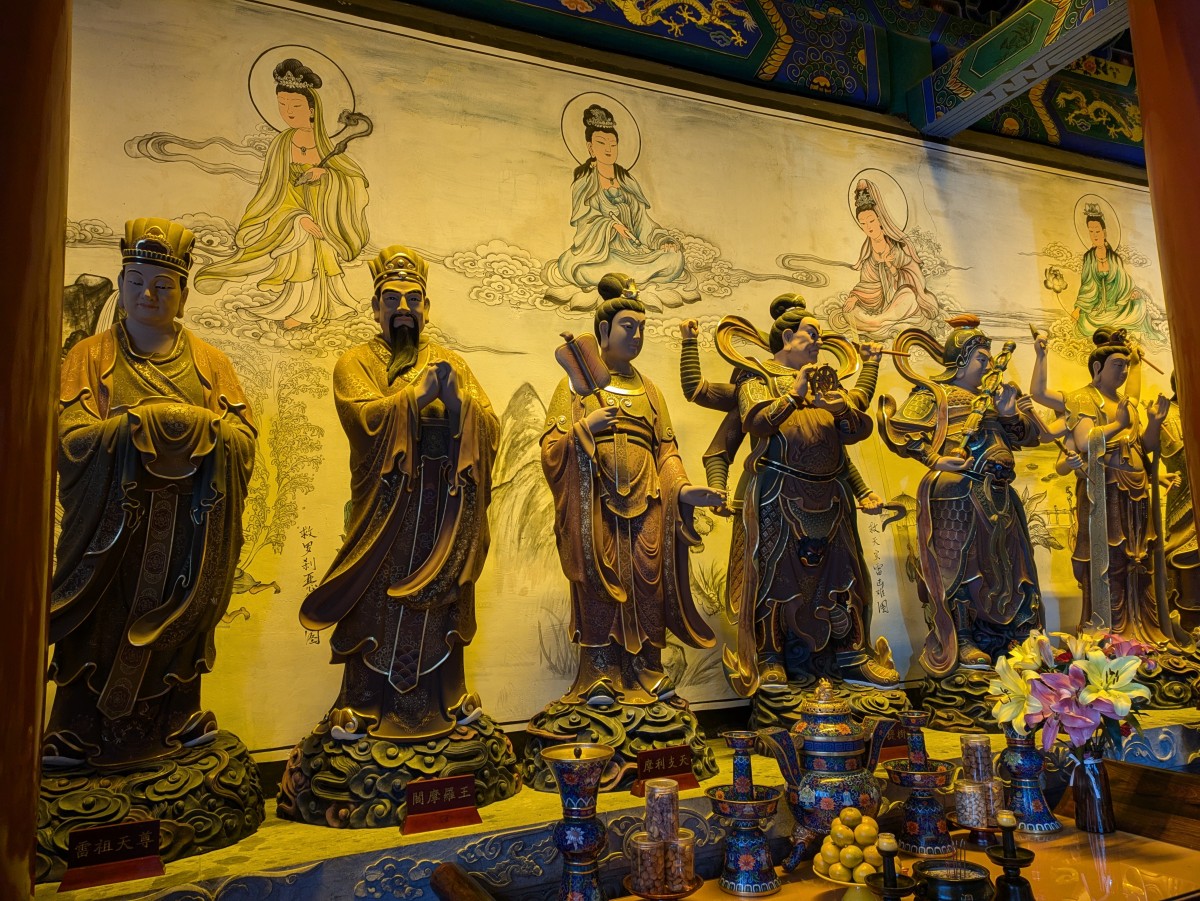 Flankiert wird der Hauptaltar von einer Reihe von lebensecht wirkenden Statuen aus dem konfuzianischen Kulturkreis.