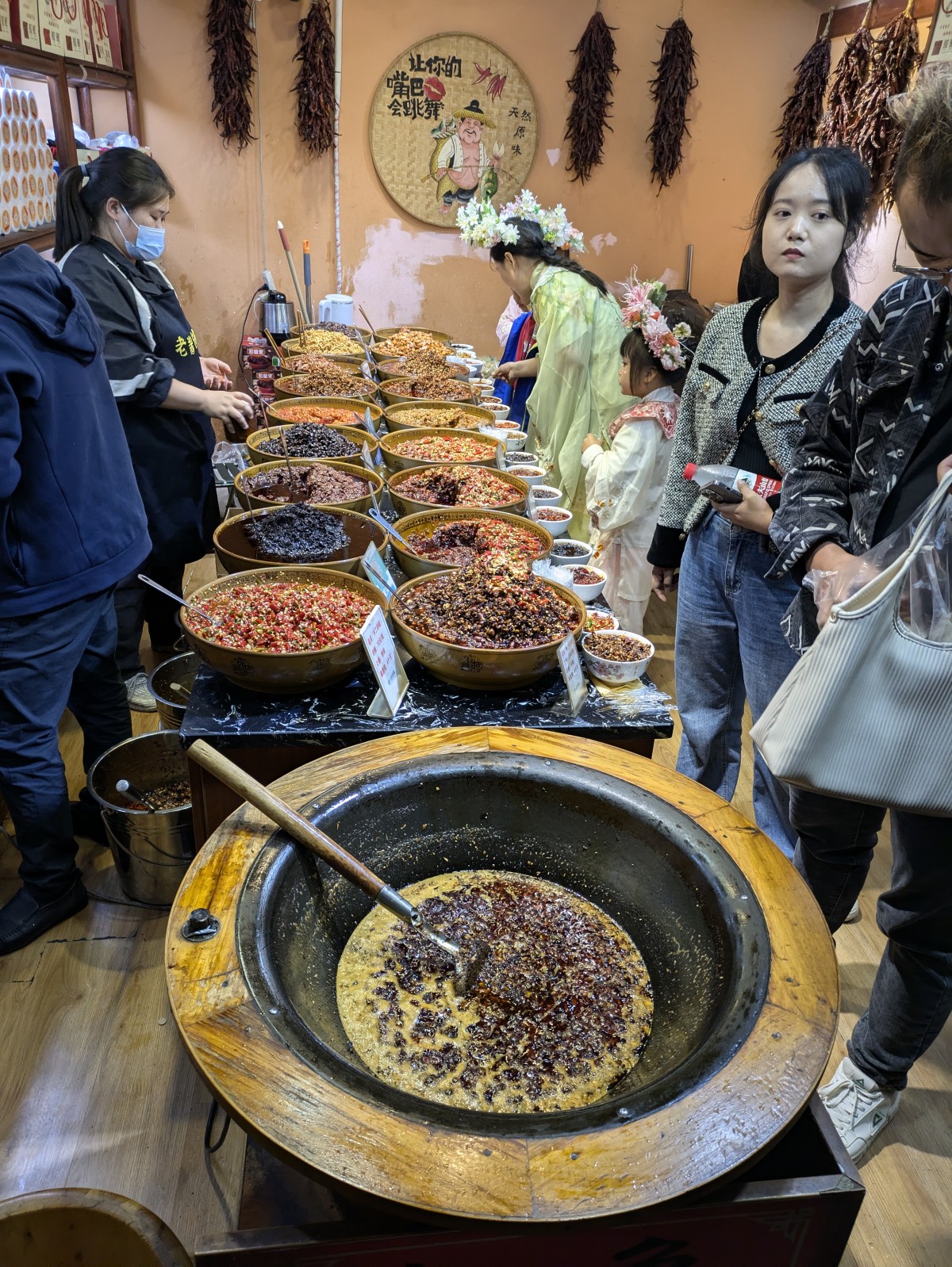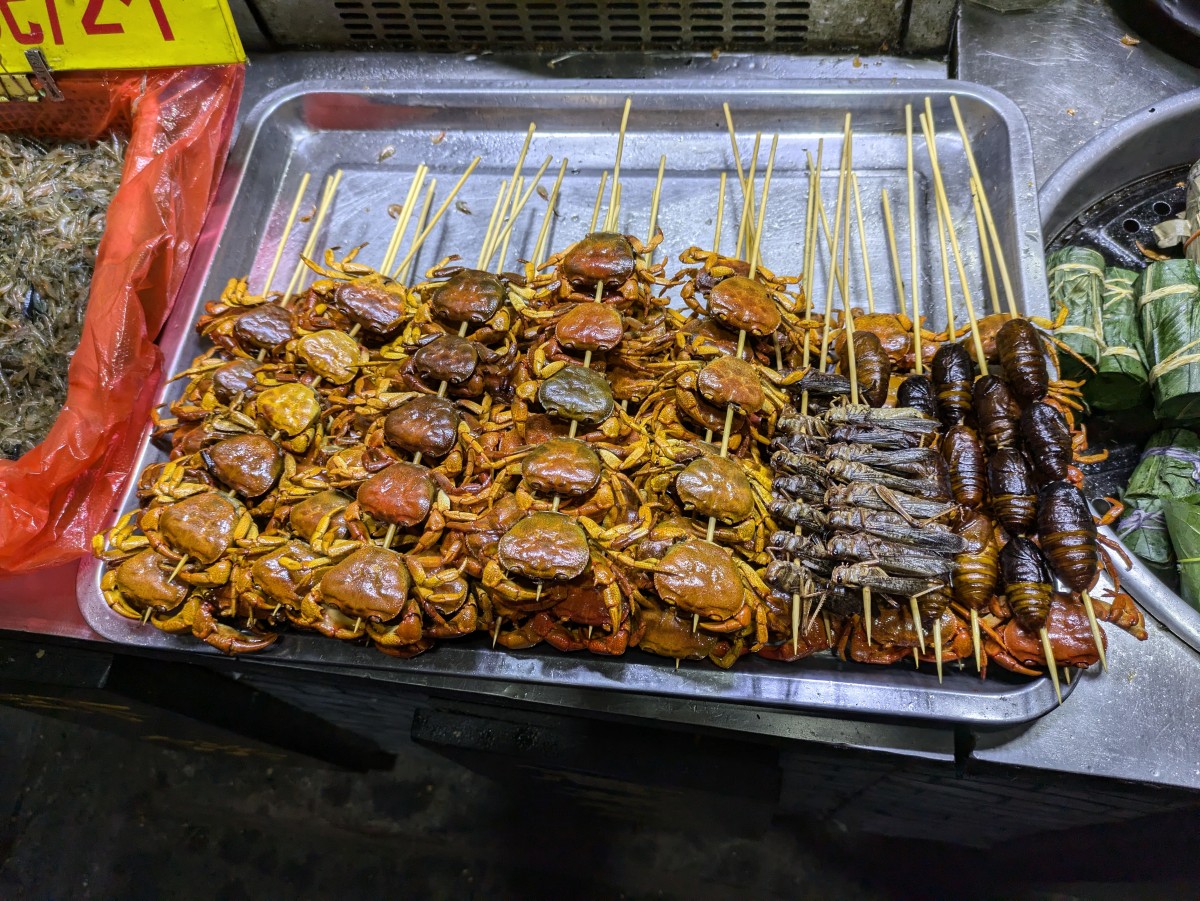 ...nämlich Spieße mit kleinen Krebsen, Heuschrecken und dicken Maden. Wem es schmeckt...