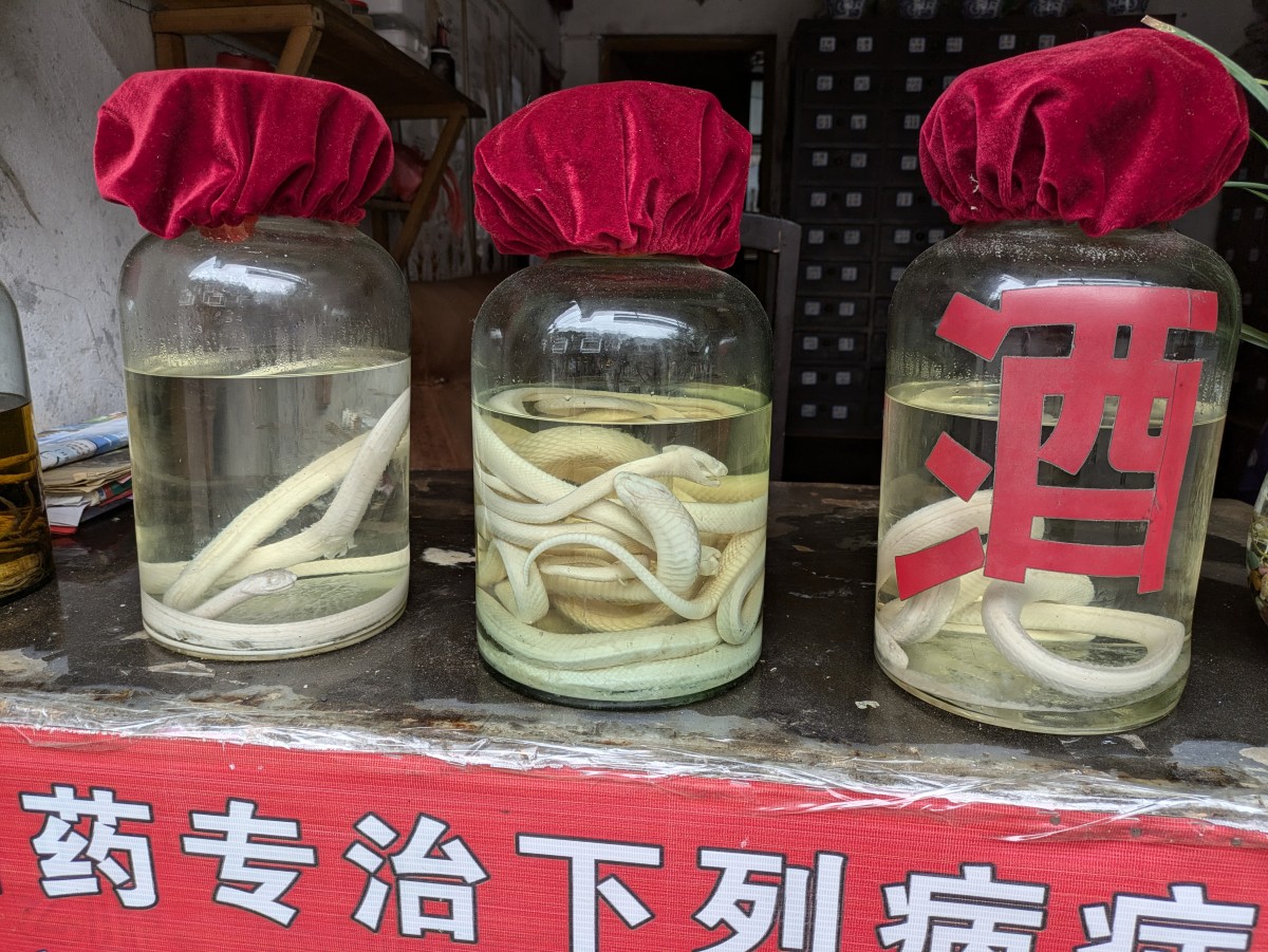 Die eingelegten Schlangen verleihen dem Schnaps eine lebensverlängernde Wirkung.