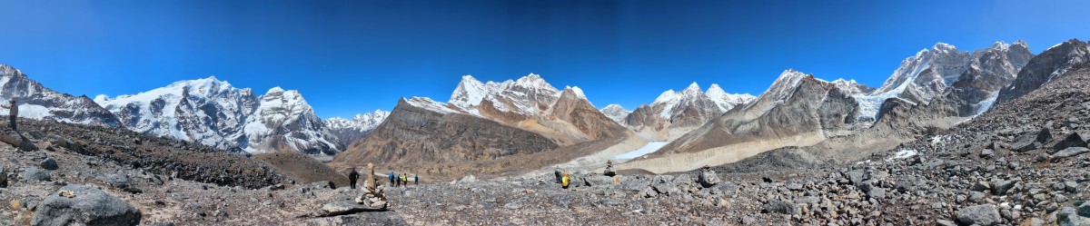 Richtig, der vierte Achttausender Cho Oyu präsentiert sich als breiter weißer Riese links im Bild.