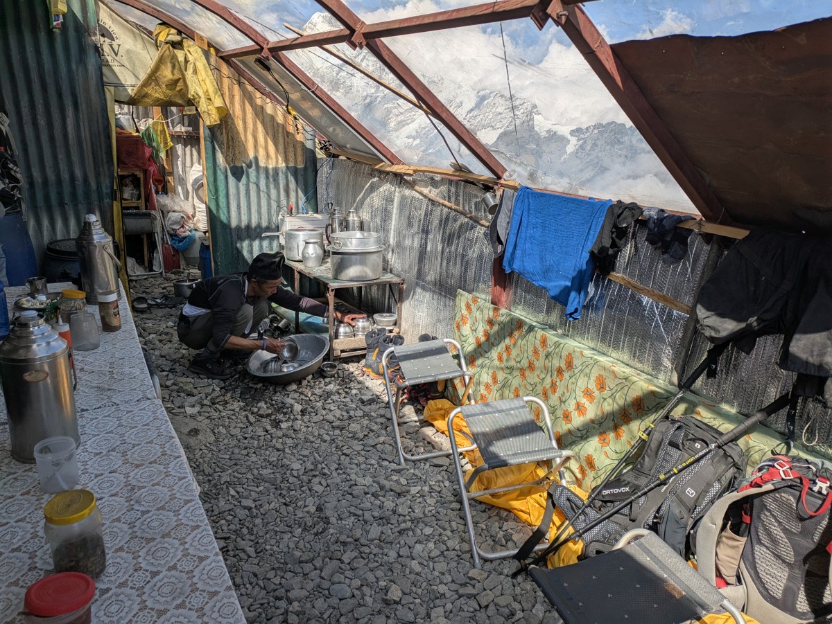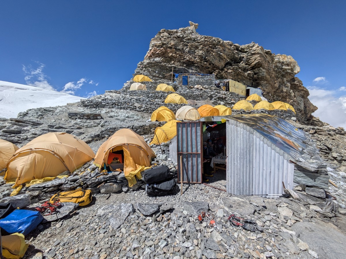 Nach dem Wecken schälen wir uns aus den Zelten und begeben uns in die Barracke - welch ein Komfort, auf 5800 Metern ein warmes