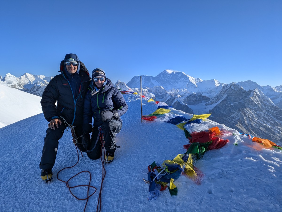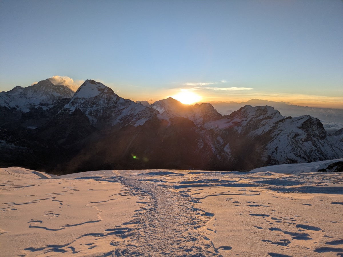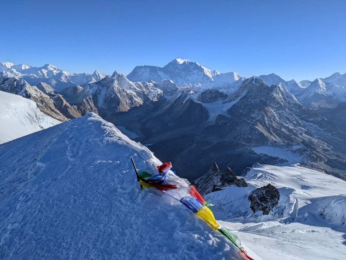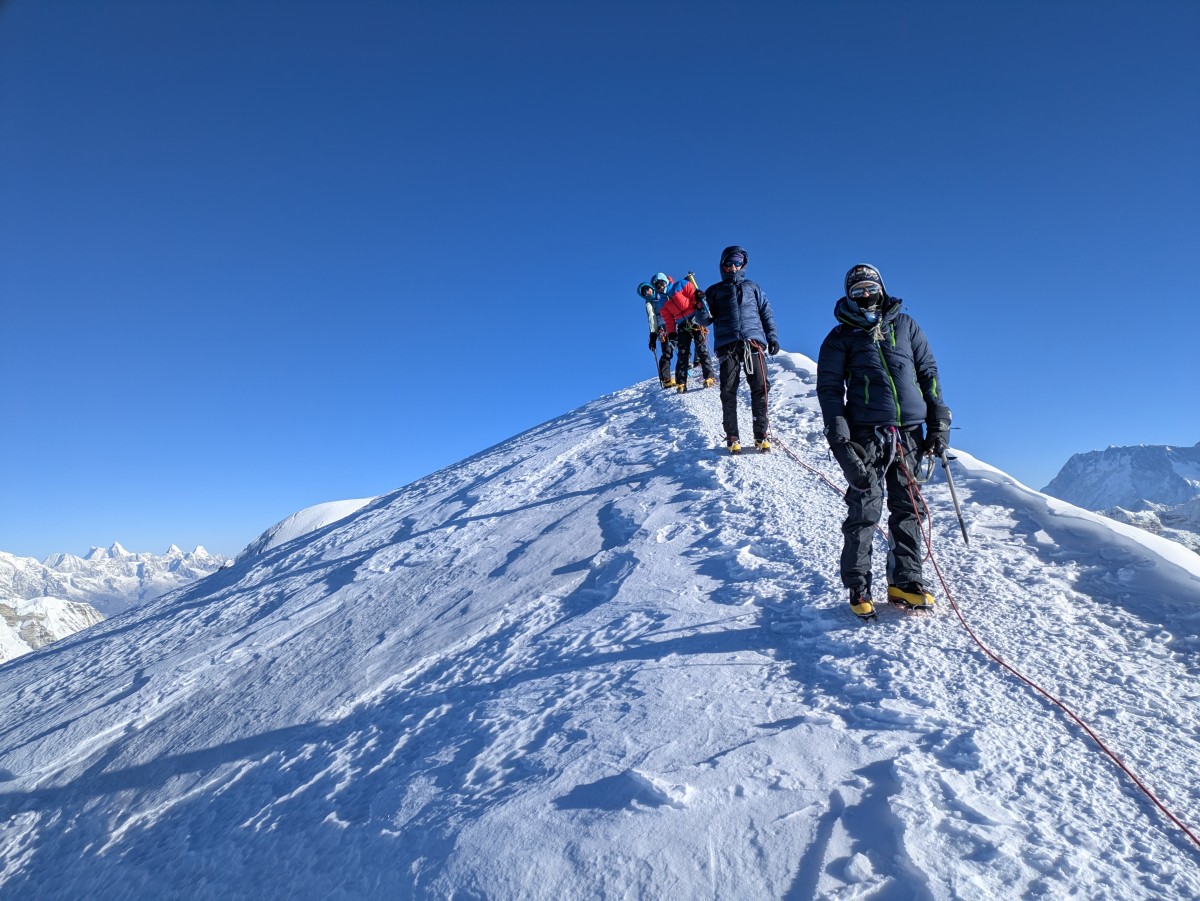 Wir überwinden das letzte etwas steilere Gratstück und stehen schließlich um halb sieben in der Früh am Gipfel des Mera Peak