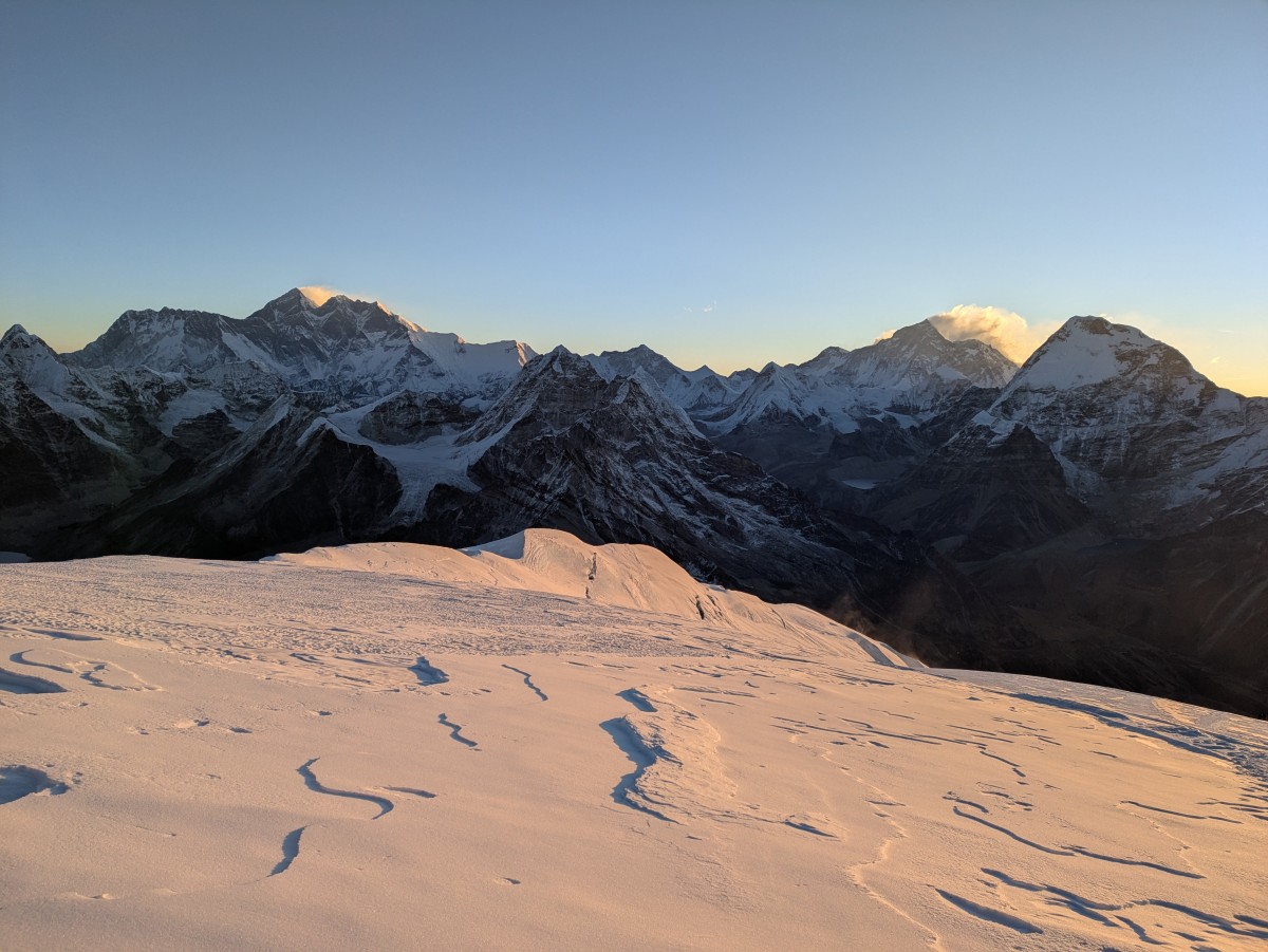 der drei Spitzen. Direkt rechts daneben präsentiert sich der Lhotse als dritter Achttausender verschämt hinter einem dünnen