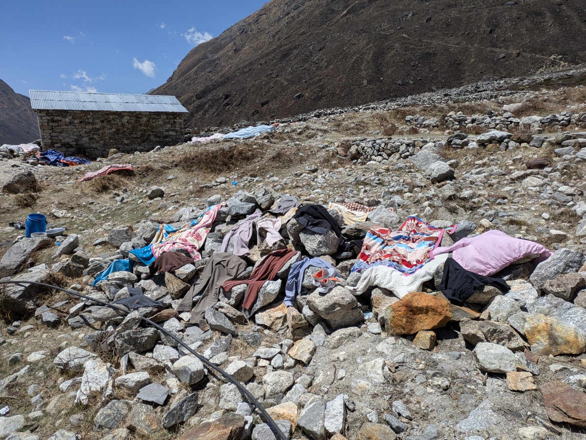 zehn Uhr vormittags wieder hinunter nach Khare geht. Dort laufen wir nach Mittag ein - das Gipfelabenteuer ist gesund und
