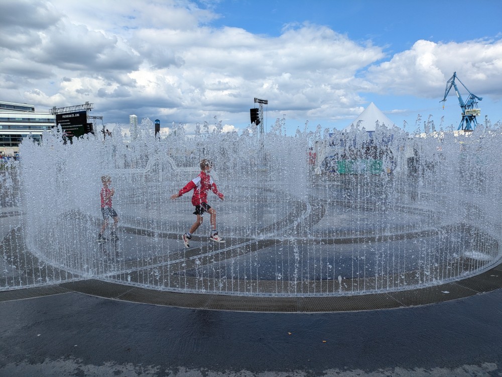 auch die Fanzone der Fußball-EM in Aarhus direkt am Hafen in voller Aktion; die Dänen versammeln sich in friedlicher Party-Stimmung auf dem Kunstrasenplatz...