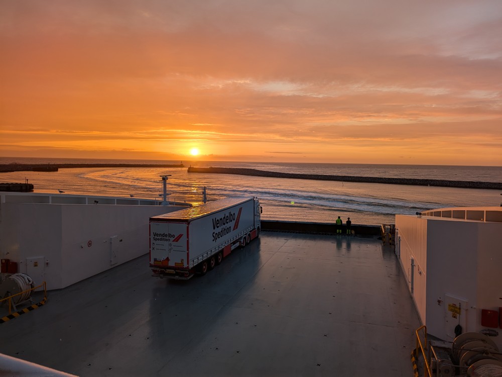 Irgenwann ist es dann doch an der Zeit, zur Fähre zu fahren. Um kurz vor zehn parken wir den Bus im Schiff, und wir legen im orangeroten Abendlicht von Dänemark