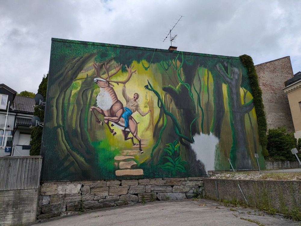 Zunächst rollen wir durch die Wälder und Täler Südnorwegens nach Skien, wo wir uns bei einem kurzen Spaziergang die interessante Mischung aus poppiger Street-Art...