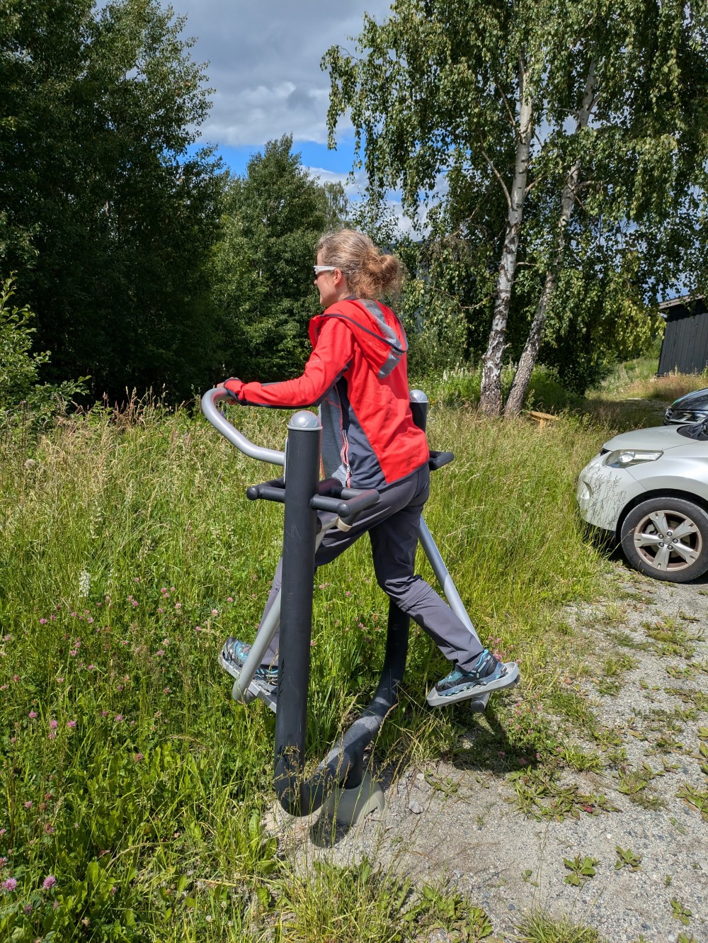 Freiluft-Trainingsgeräten, hier am Parkplatz eines kleinen Supermarktes.