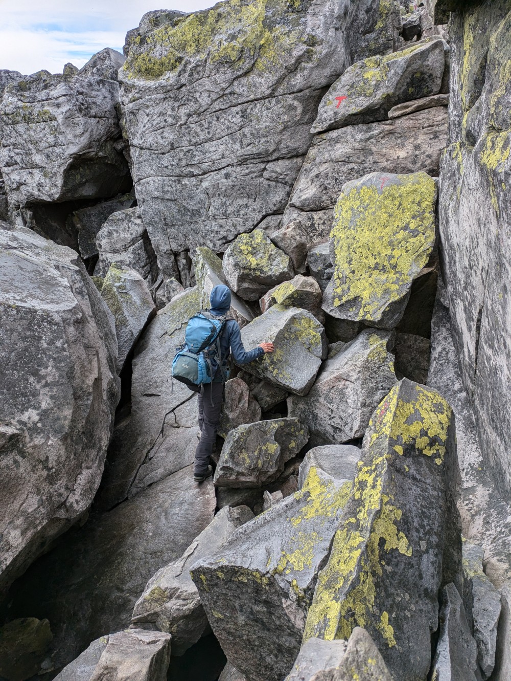 Wir genießen die Umgebung mit ihrer schönen Kombination aus grauem Fels, hellgrünen Flechten und Wolkenhimmel.