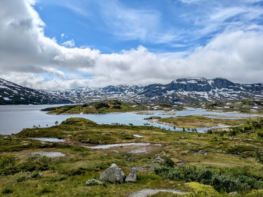 Haukeliseter - wir bewundern die Aussicht über schneegefleckte Berge und hellblaue Seen vom bekannten Ausgangspunkt vieler Wanderungen in