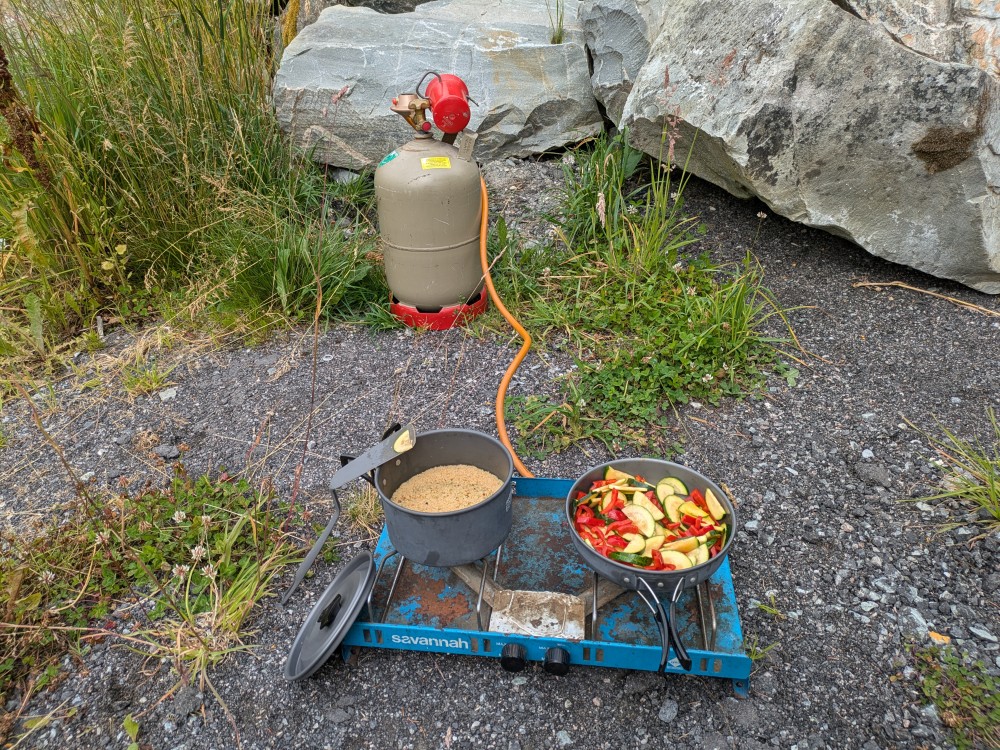 Wieder am Bus angekommen bereiten wir unser Abendessen zu, und zwar nicht am eingebauten Kocher, sondern aufgrund des schönen Abends auf dem Freikocher, den ich