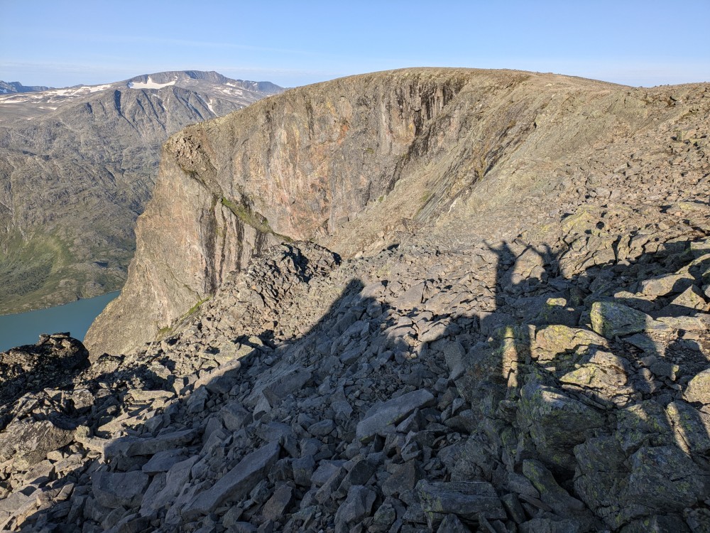 Bald schon können wir vom breiten Rücken zum Veslfjellet aus nach links in die Tiefe starren.