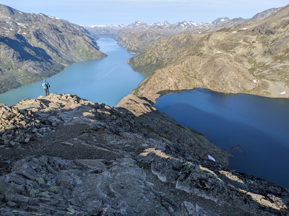 uns der Gjendesee mit seiner vom Gletscher her türkisen Farbe, rechts liegt deutlich weiter oben der tiefblaue Bessvatnet. An der schmalsten