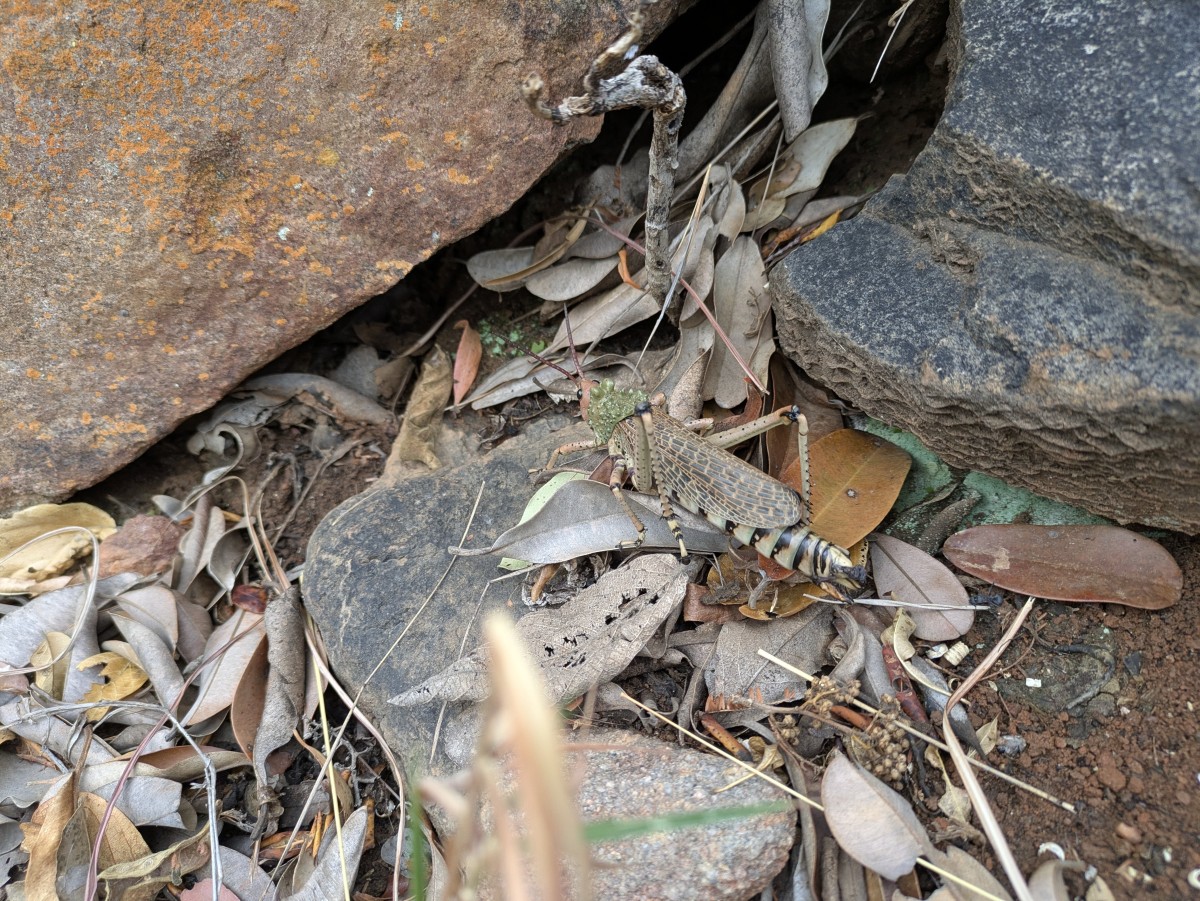 Eine große Heuschrecke erweckt meine Aufmerksamkeit. Das Heupferd ist wohl um die sieben Zentimeter lang.
