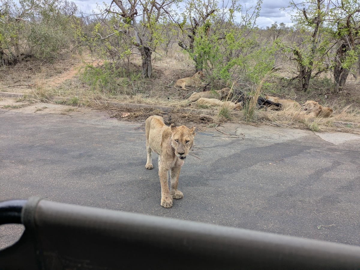 Eine der Jägerinnen macht ein paar Schritte auf unser Fahrzeug zu. Ich versinke noch etwas tiefer hinter der Tür, die nur aus einer Plane besteht, und hoffe, daß mich die Löwin durch die nicht vorhandene Fensterscheibe nicht als Beute erkennt...
