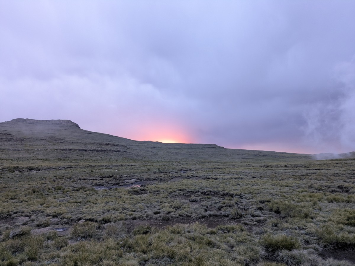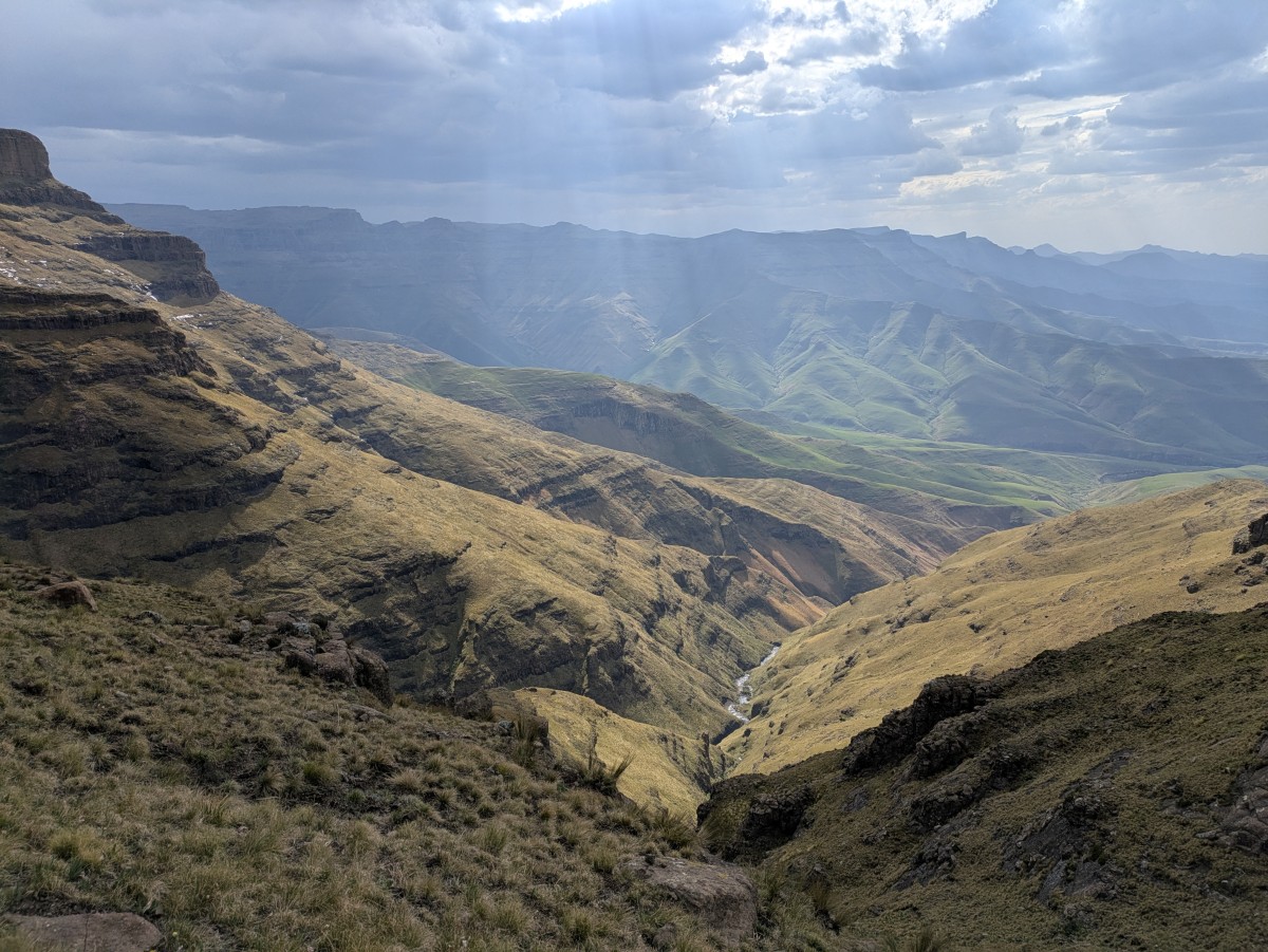 Endlich sind wir auf dem Hochplateau der Drakensberge angekommen, also auf um die 3000 Meter über Meer. Auf dieser Höhe wird uns die Tour über die nächsten vier Tage weiterführen. Die Blicke hinab in die Steilabbrüche sind ungemein reizvoll.