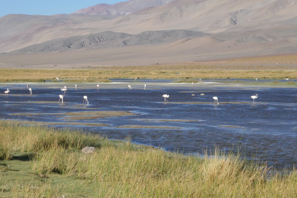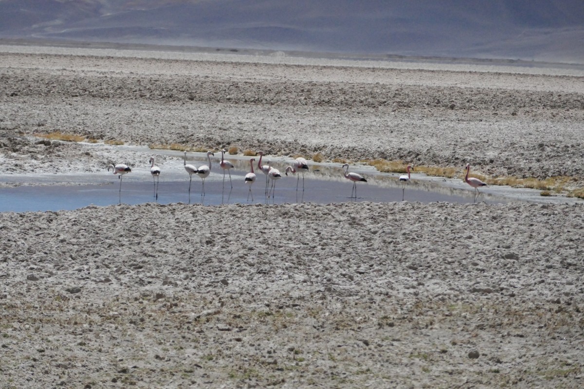 Weiterfahrt nach Antofagasta de la Sierra. Flamingos in einer der Salzpfannen