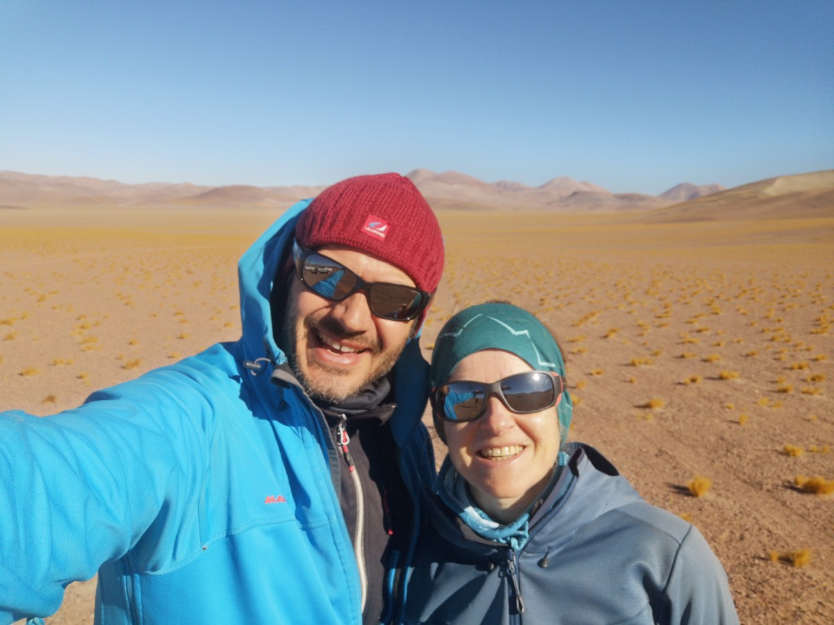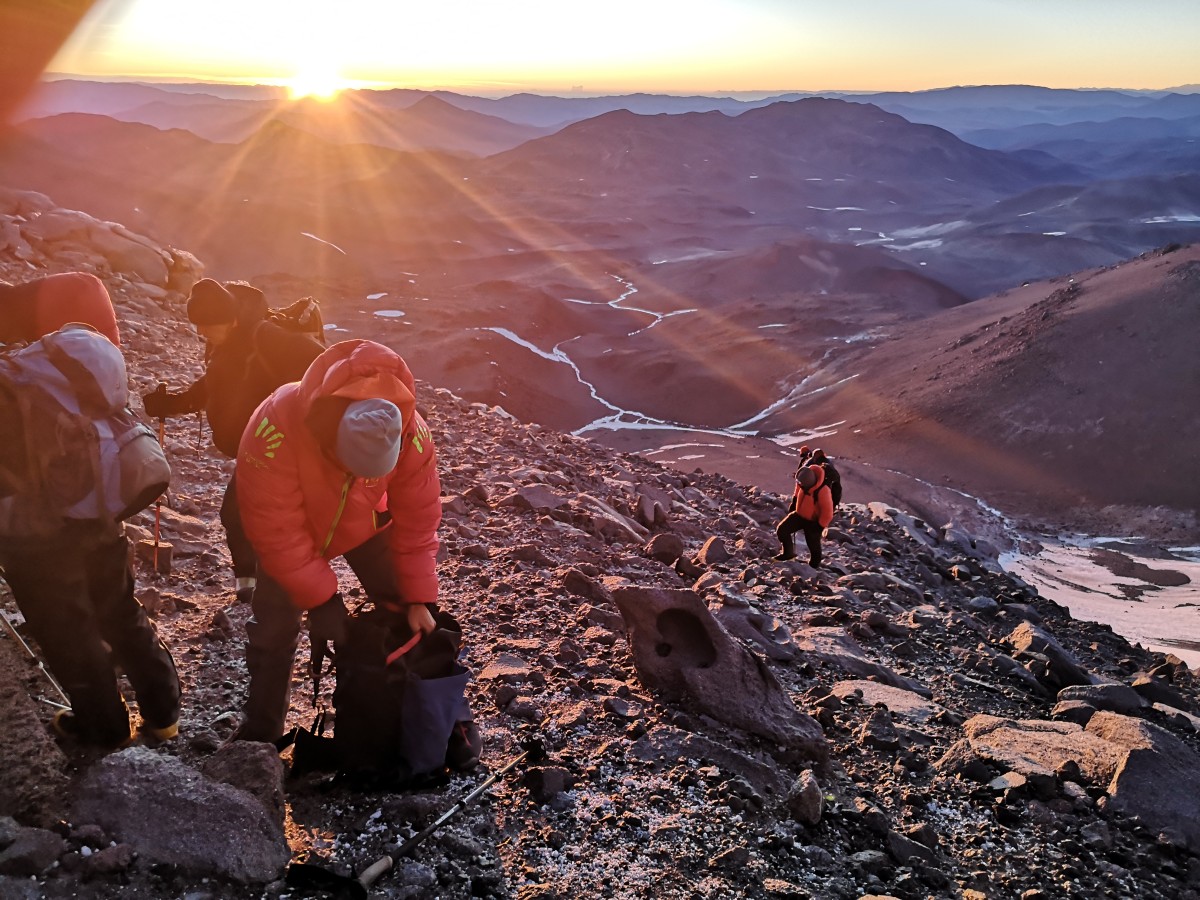 Gipfeletappe Ojos del Salado. Abermals Wecken um drei, Aufbruch um vier. Der Sonnenaufgang bringt endlich etwas Wärme; in den windigen Bedingungen ist es