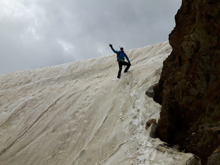 nochmals unterhalb eines schwarzen Felsens, bevor die letzte Kletterlänge uns direkt auf den Grat führt. Die Eisenzeit ist