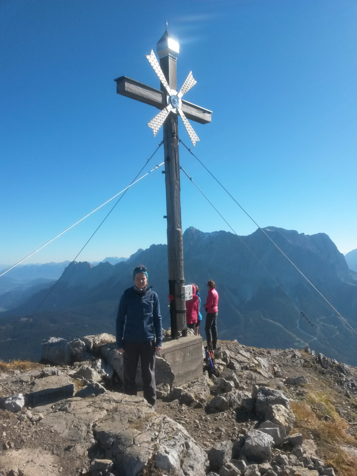 weiter. Im Photo hinter dem Gipfelkreuz zeigt sich die Zugspitz-Nordseite, die wir vor einigen Wochen in der