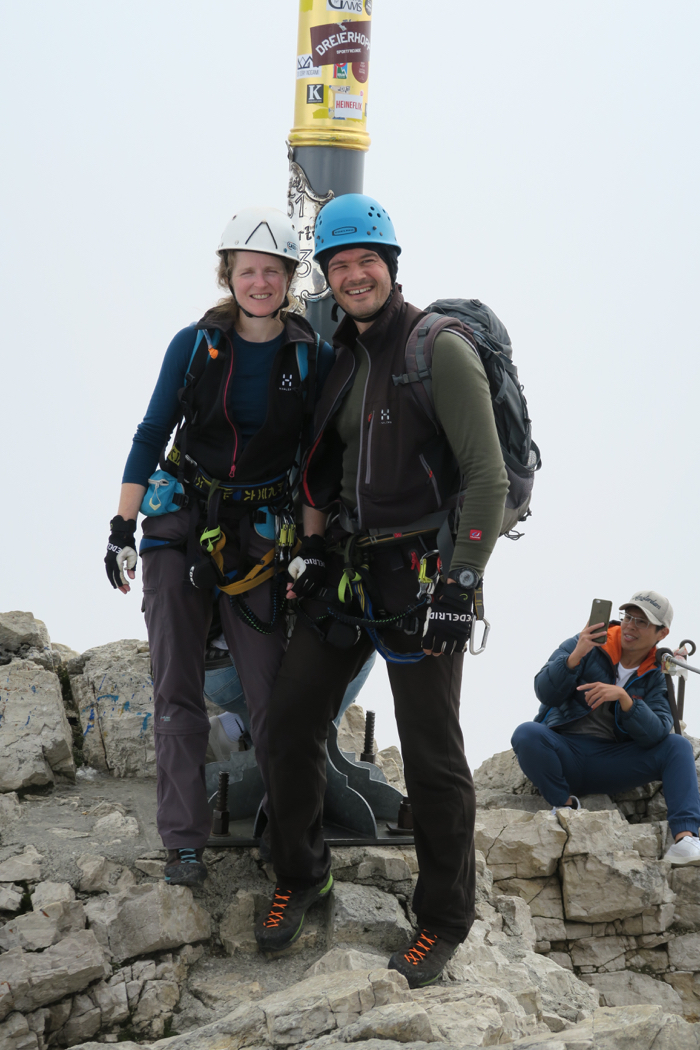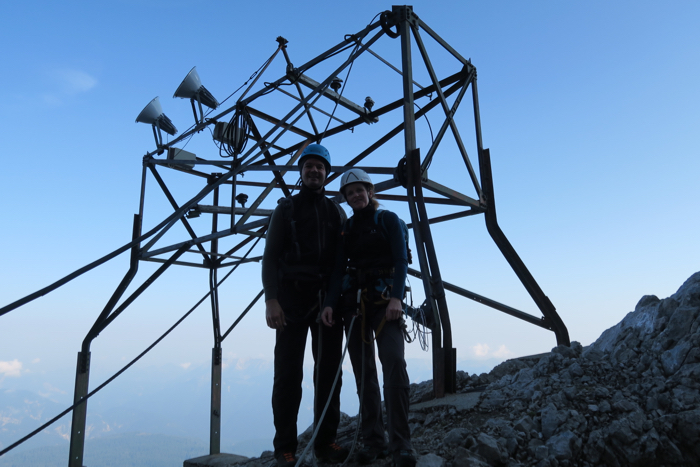 Endlich geschafft! Nach neun Stunden, 1200 HM Kletterstrecke und insgesamt etwa 2000 Hm stehen wir am Zugspitz-Gipfel. Ein