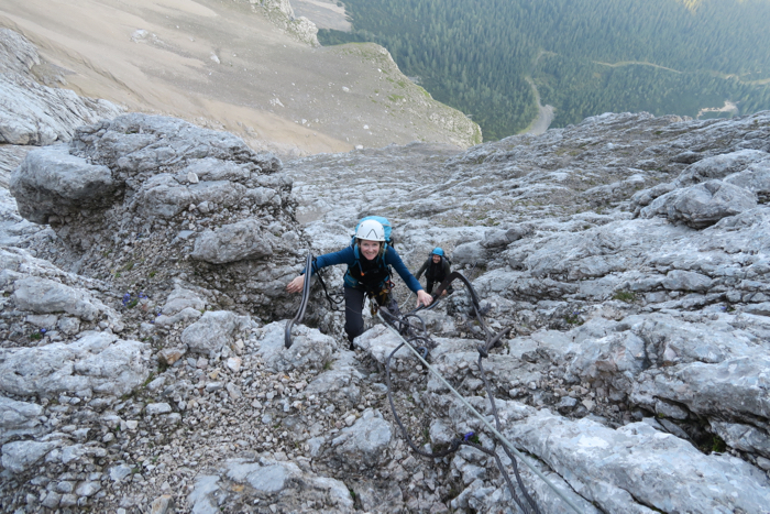 Dann zieht die Route nach links direkt in die Wand. Die ersten Höhenmeter sind noch steiles Gehgelände. Je höher wir