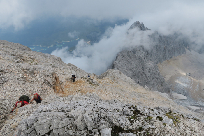 Klettersteig-Gelände an, bevor wir am höchsten Punkt der Zugspitze stehen.