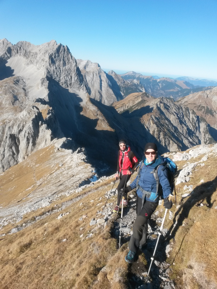 Sonne nach oben, beäugt von der ein- oder anderen neugierigen Gams. Erst am Grat wird es zugig, und wir legen