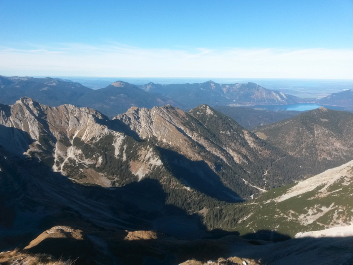 Der Blick nach Nordwesten zum Walchensee; darüber Heimgarten und Herzogstand.
