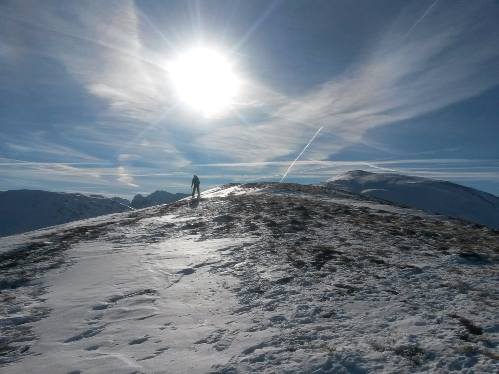 Den kurzen Rücken zum Gipfel stapfen wir bei böigem Wind hin...