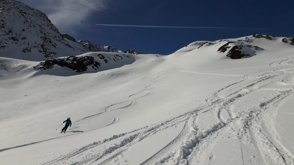 ungefährlich. So kommen wir jedoch relativ gut zum Joch hinunter, von dem aus die Piste dann weitläufig wieder ins