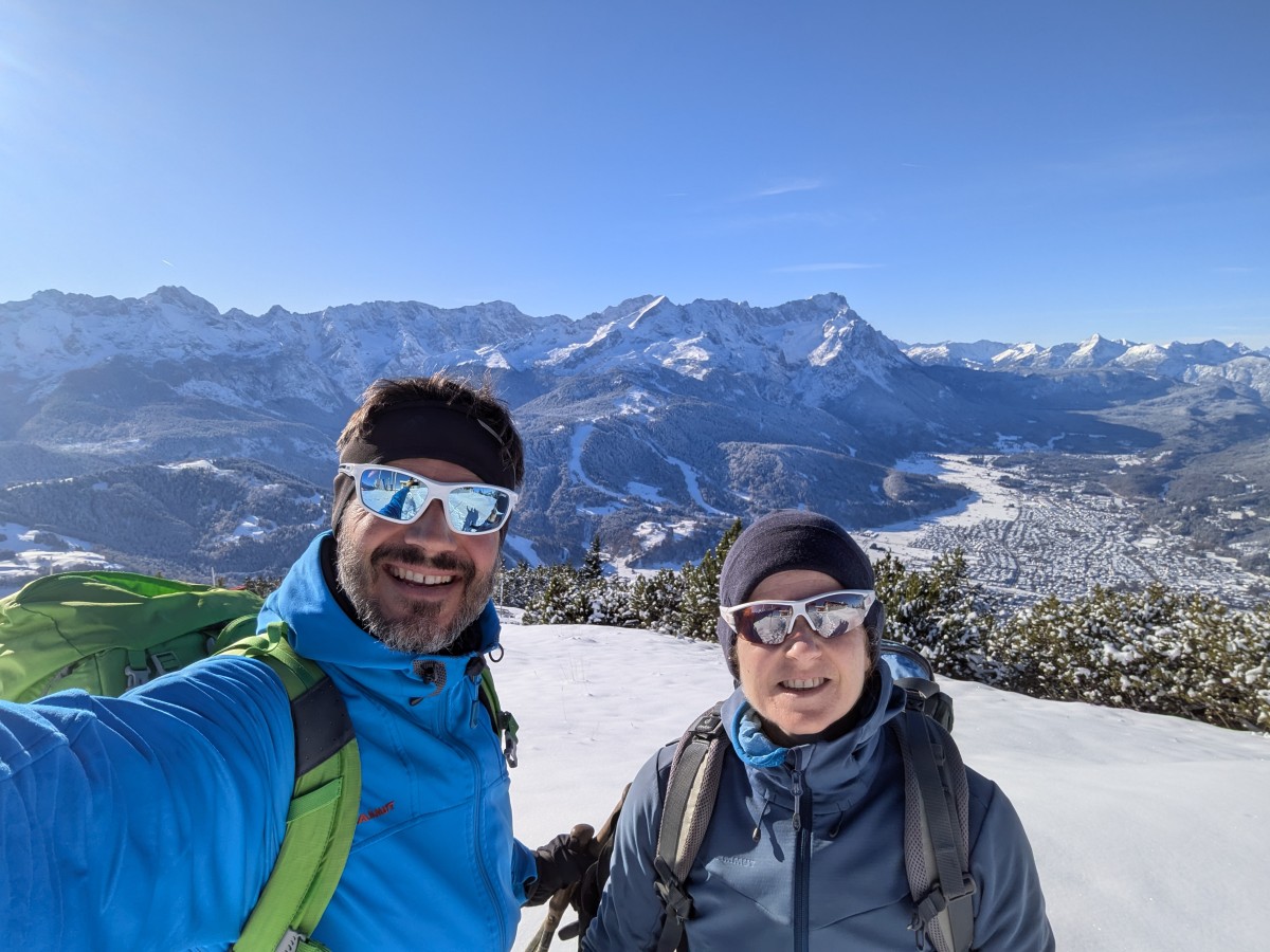 Es dauert nach dem vielseitigen Urlaub im warmen Südafrika nicht lange, bis wir mit dem weißen Gold in Berührung kommen. Ende November kommen die ersten Schneefälle herab und überzuckern das Voralpenland. Wir überlegen, ob wir gleich beim ersten Anschein des Winters alles auf eine Karte setzen und eine Skitour riskieren wollen - aber natürlich wissen wir genau, daß das nun wirklich keine gute Idee für die armen Ski ist. Daher entscheiden wir uns für eine Winterwanderung vor der Kulisse des Wettersteins; es geht einmal mehr auf den Wank. Bei minus zehn starten wir morgens um acht vom Parkplatz und erleben eine frostige Morgenstimmung. Wie vorausgesehen haben wir prächtige Aussicht auf Alpspitze und Co.