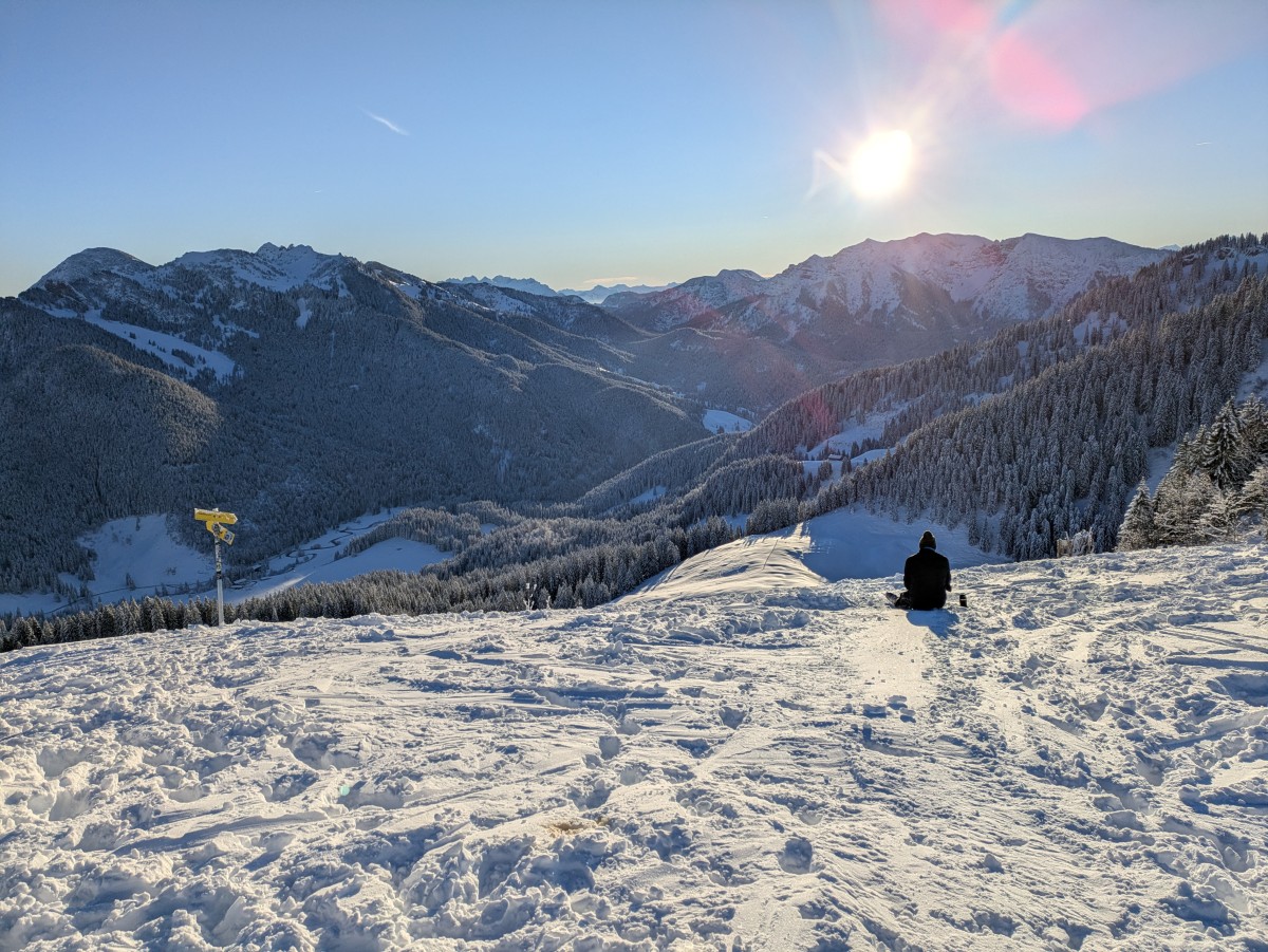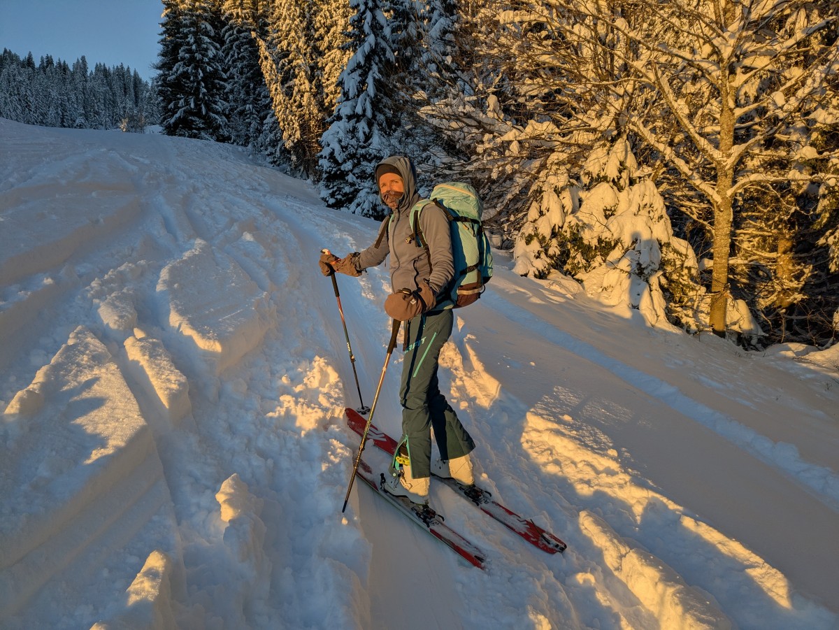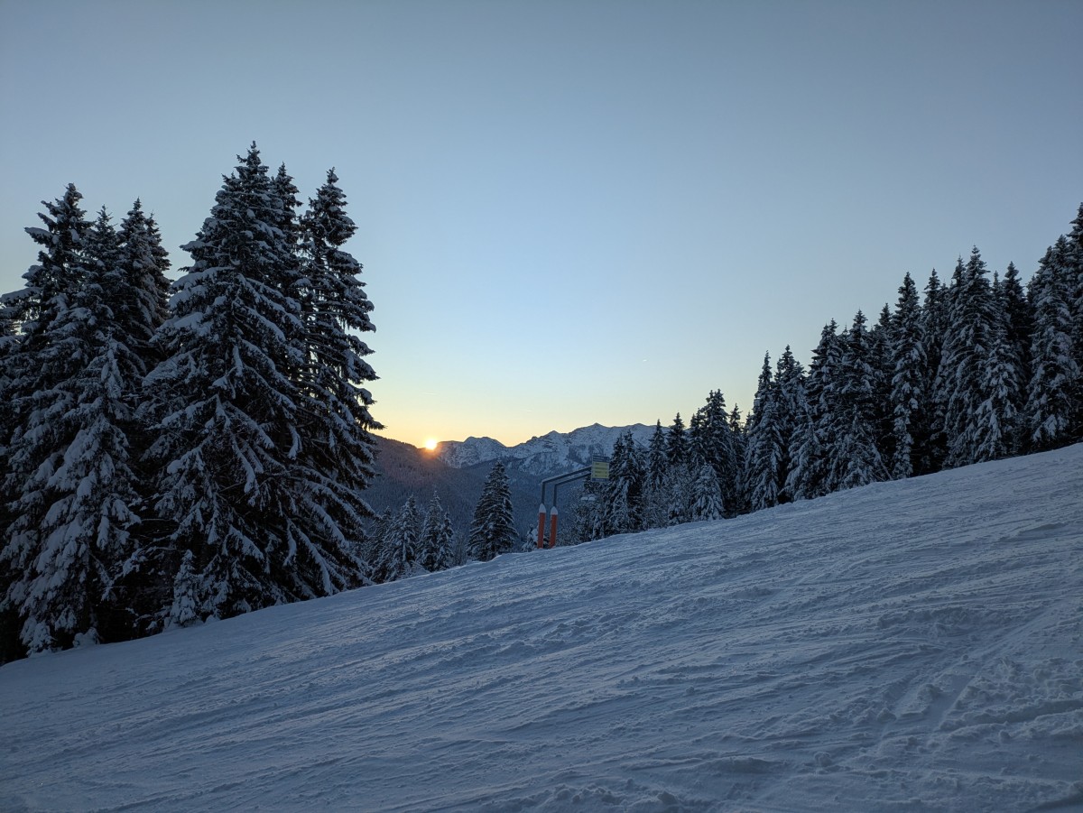 Eine knappe Woche später - wir hatten die überschwänglichen Berichte der Steinskiexperten genau studiert und in die Realität übersetzt - wagen wir uns dann an die erste Skitour der Saison. Wieder einmal bewegen wir uns auf der Piste von Roßkopf und Stümpfling in sowohl lawinen- als auch skitechnisch ungefährlichem Gelände. Um halb acht starten wir bei zapfigen Temperaturen vom Parkplatz des Kurvenliftes und können nach zehn Minuten der Sonne zusehen, wie sie über dem Horizont aufgeht.