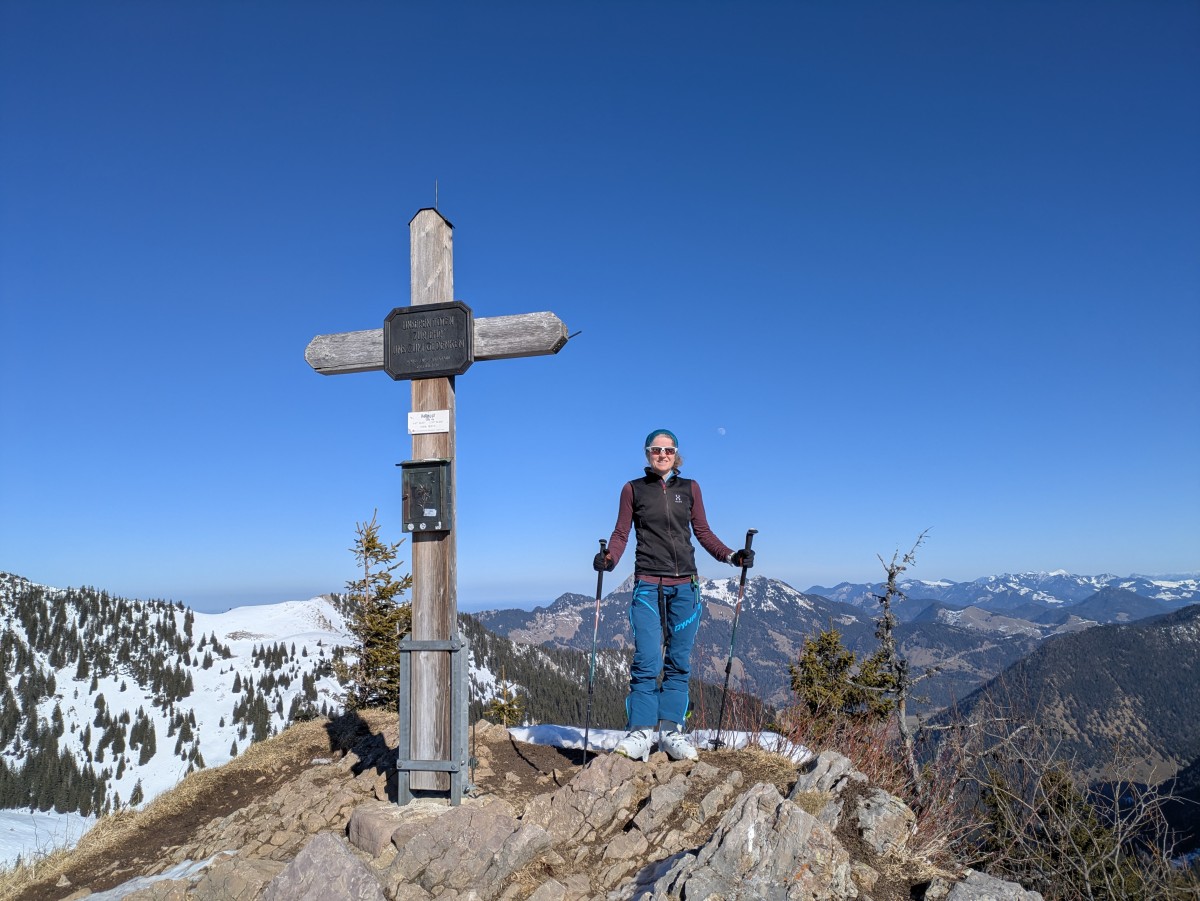 Endlich kommt rechts das Gipfelkreuz in Sicht. Achtzehnhundert Höhenmeter liegen uns seit dem Parkplatz der Hausbergbahn in den Beinen.