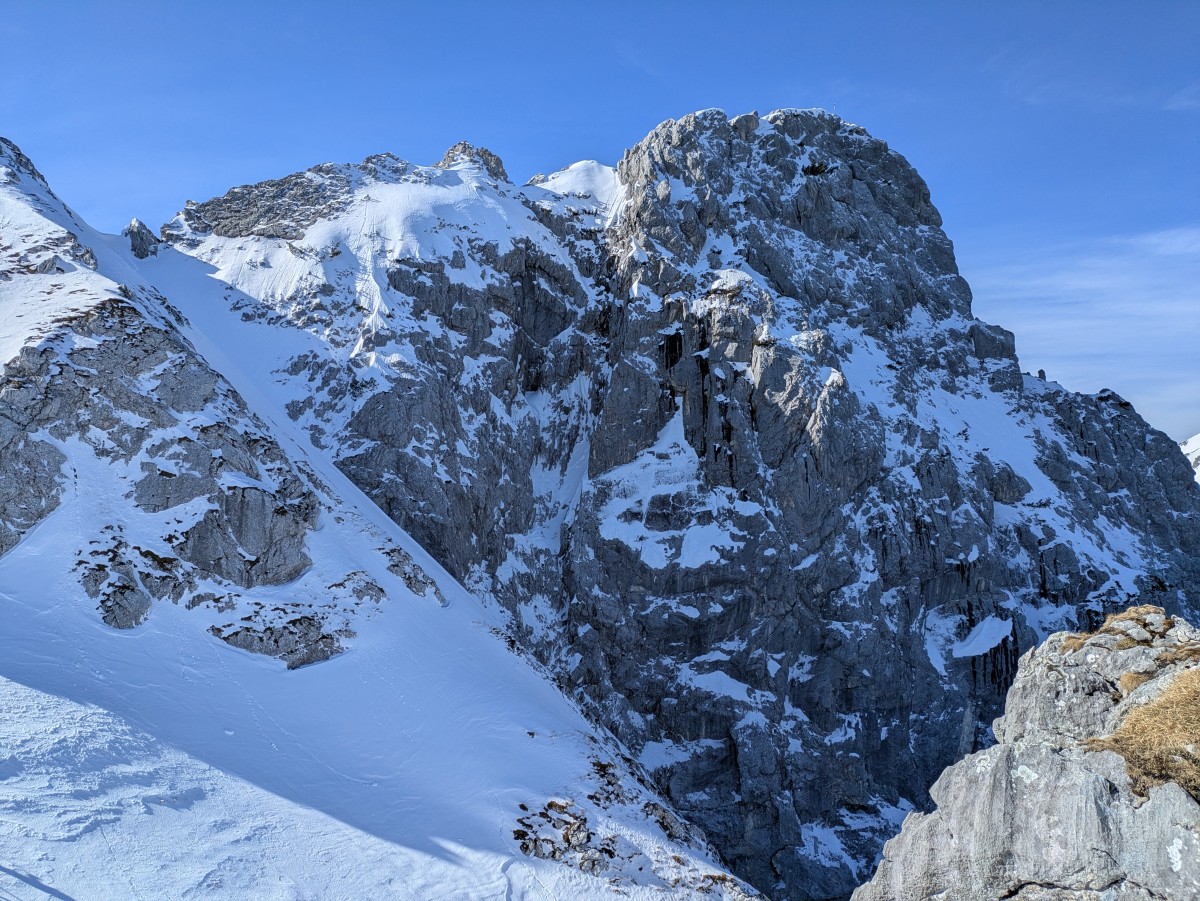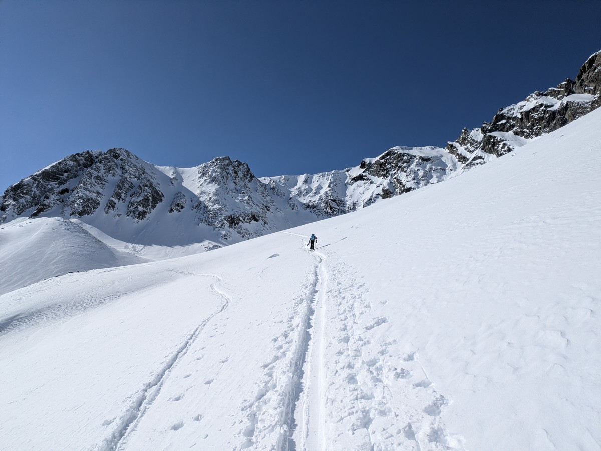 Vom Gipfel der Blick hinab auf die Aufsteigsspur, die dann in den Steilhängen verschwindet.