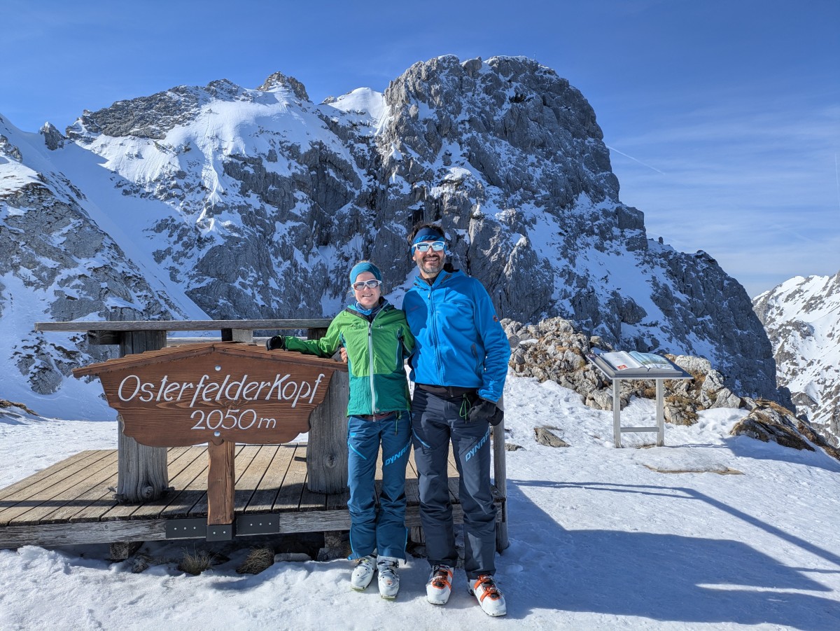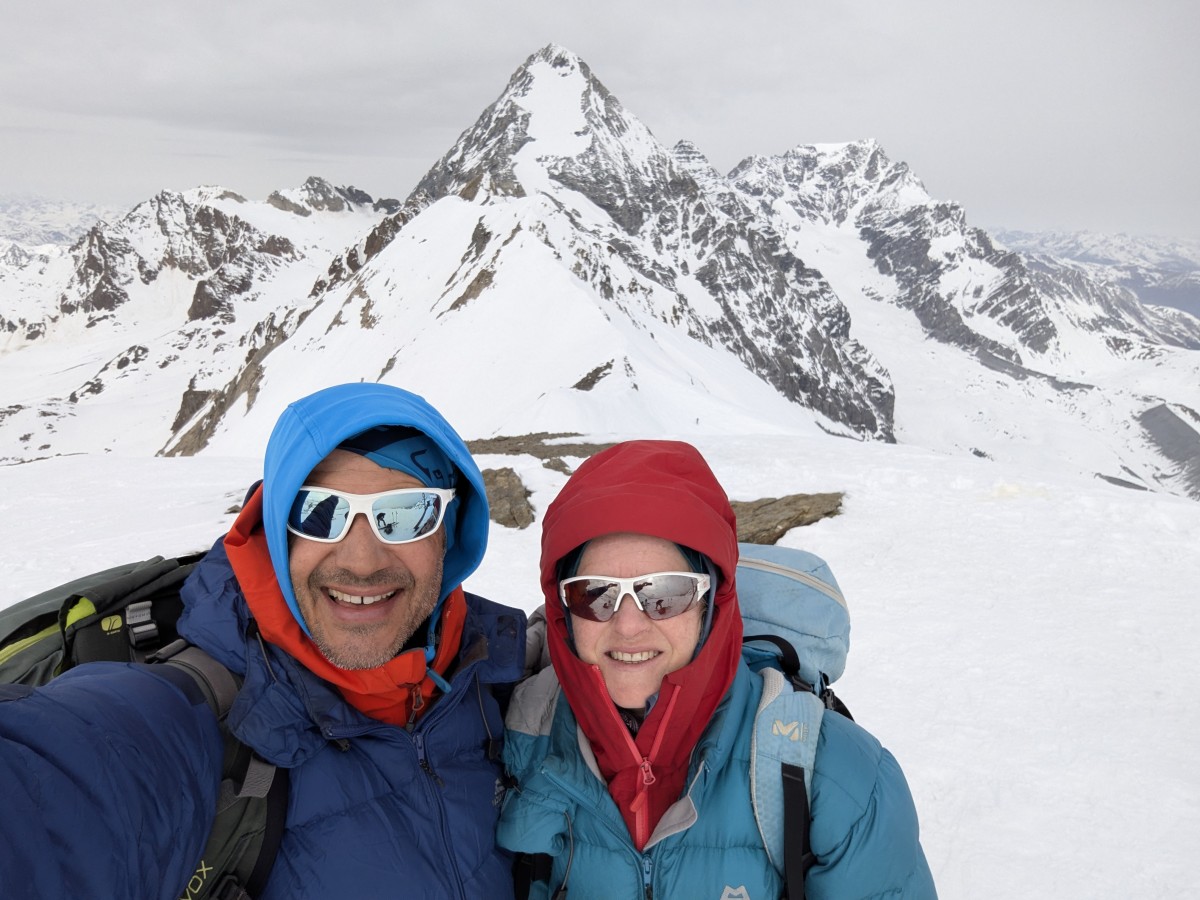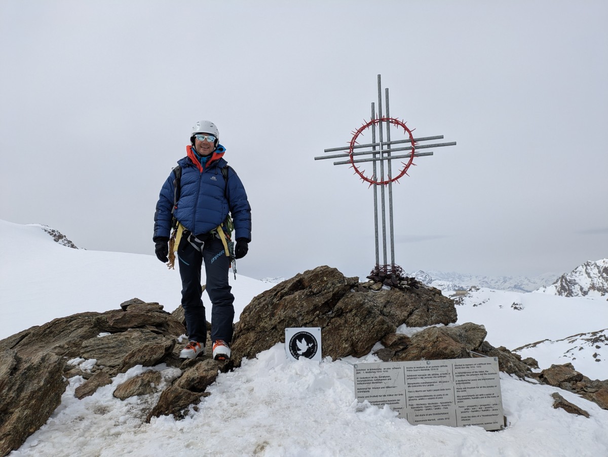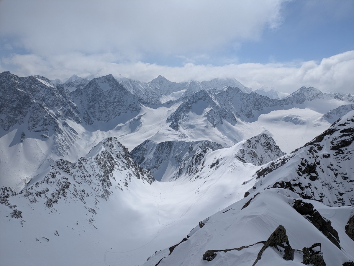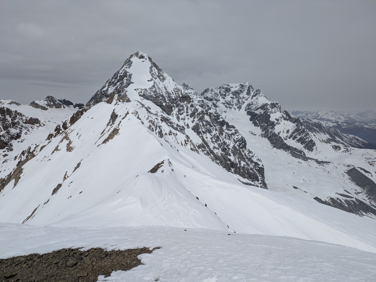 Nach dem letzten steilen Aufschwung zum Gipfel erreichen wir das Skidepot und stapfen unschwierig weiter zum höchsten Punkt. Tatsächlich können wir eine Viertelstunde zu zweit allein die prächtige Rundumsicht bewundern.