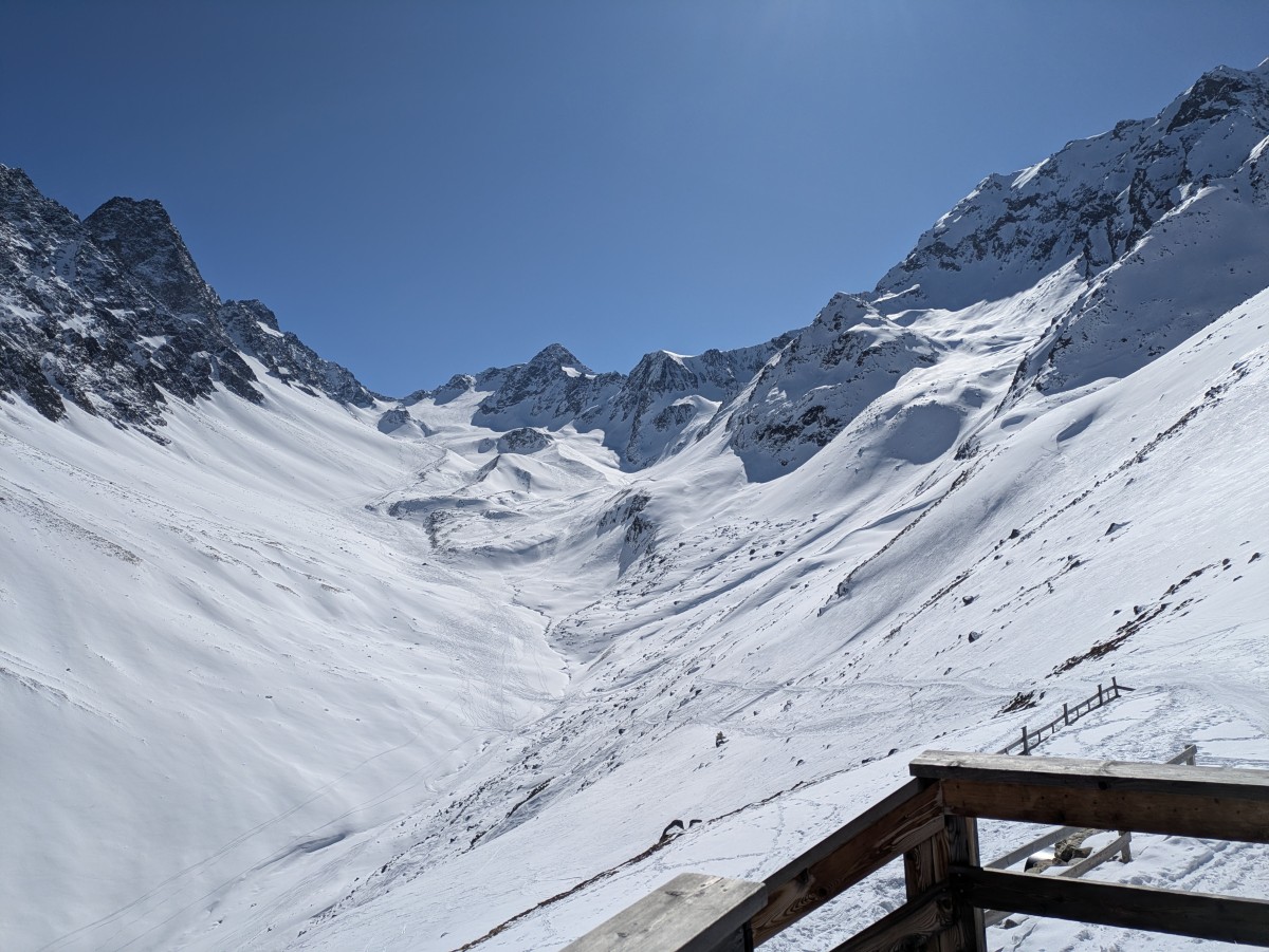 Nach eine kurzen Pause genießen wir den Firn in der Abfahrt - wunderbar! Beim Bernadein-Schlepplift schauen wir uns kurz in die